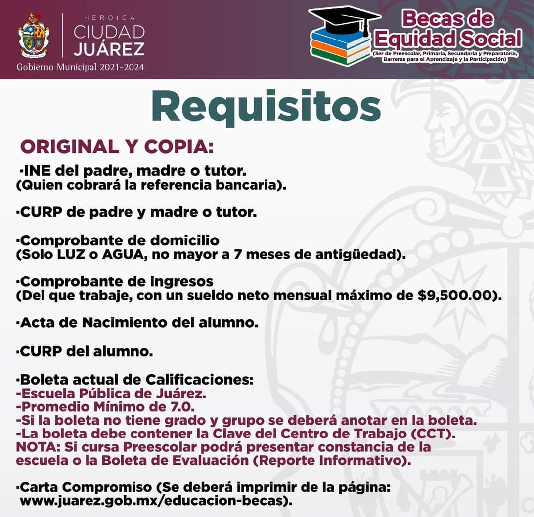 El beneficiado debe estudiar en una escuela pública de la ciudad, tener un promedio mÃnimo de 7.0 y si cursa el preescolar es necesario presentar constancia de la escuela o boleta de evaluación. También es importante entregar una carta compromiso que se podrá imprimir en la página www.juarez.gob.mx/educacion-becas
