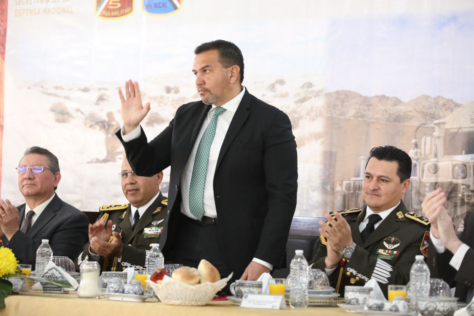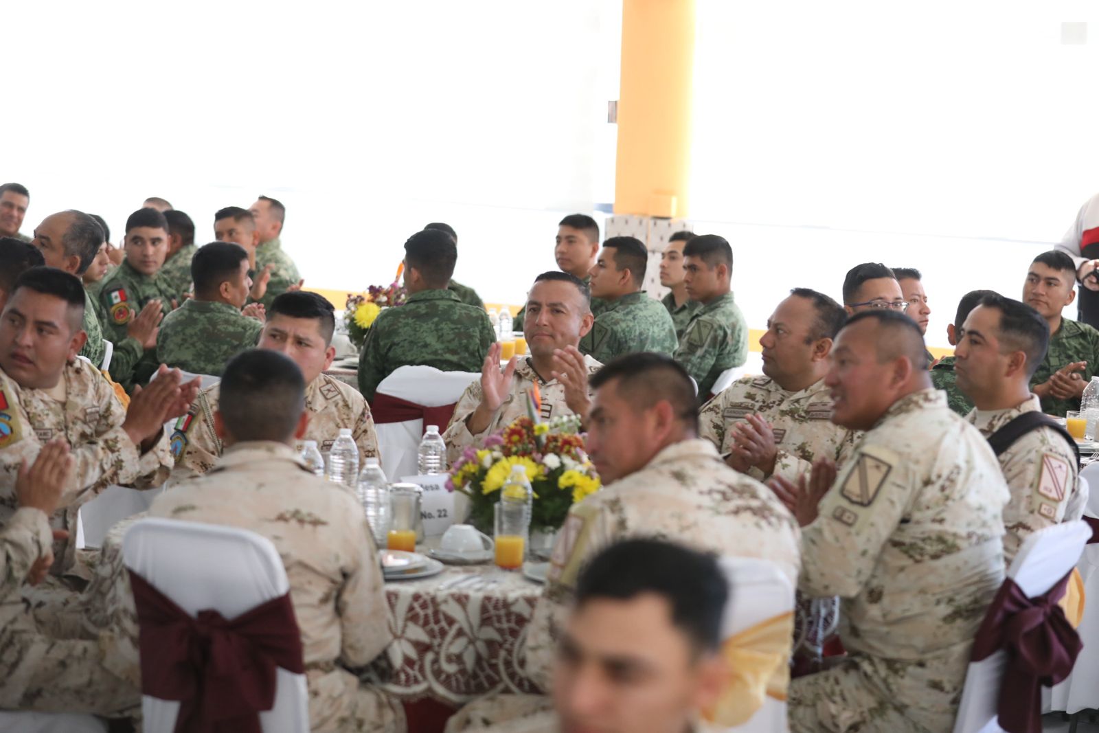 Como parte de la celebración por el Día del Ejército Mexicano, los militares disfrutaron de un desayuno, escucharon la Plegaria del Soldado, cantaron el Himno Nacional y se llevó a cabo una rifa para los elementos del Noveno Regimiento de Caballería Motorizado.