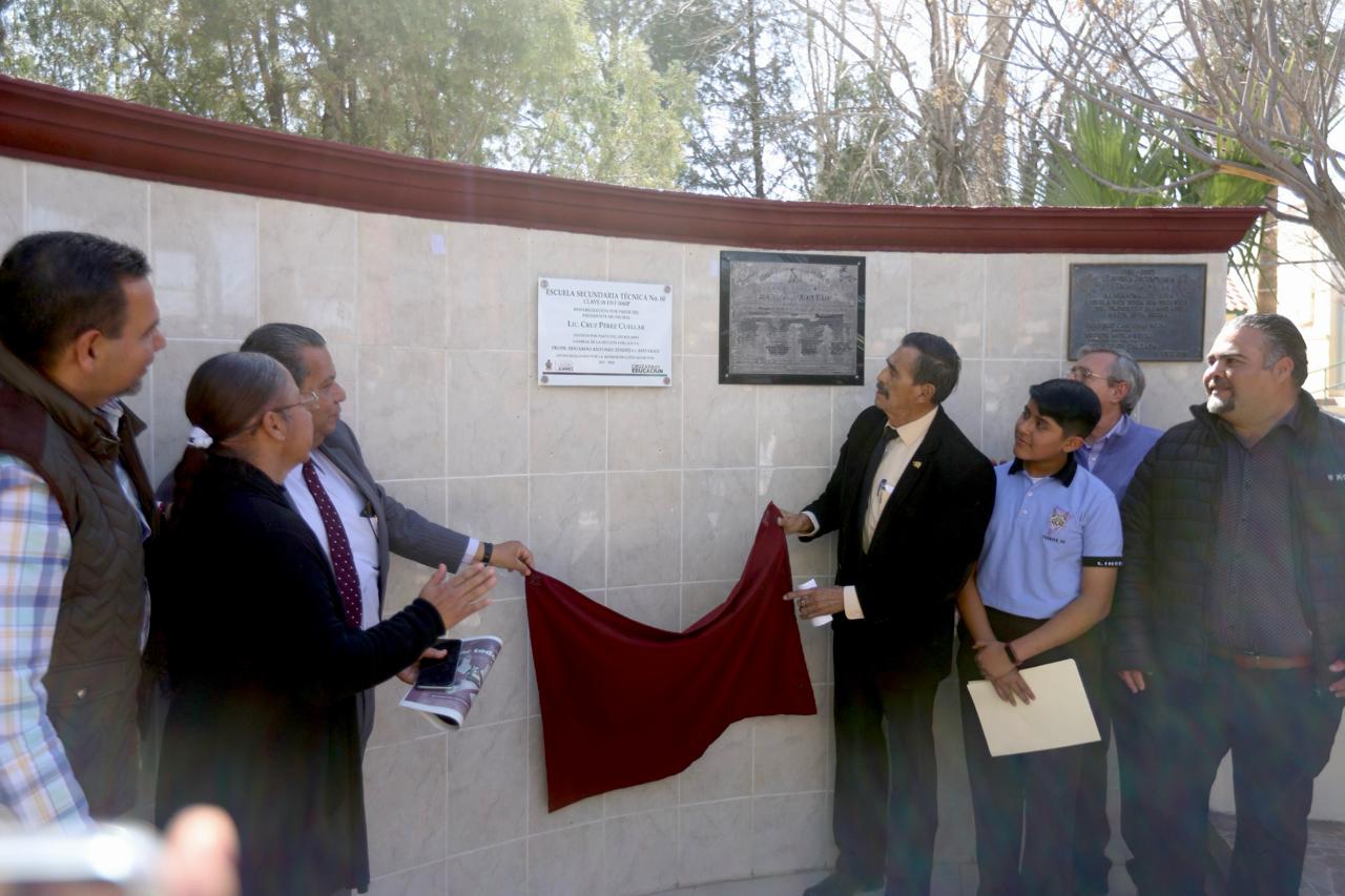 Este día el Presidente Municipal, Cruz Pérez Cuéllar, acudió a la Escuela Secundaria Técnica 60, en donde se hizo entrega de las obras de rehabilitación de la biblioteca y el comedor, obras en las que se invirtieron más de 756 mil pesos.