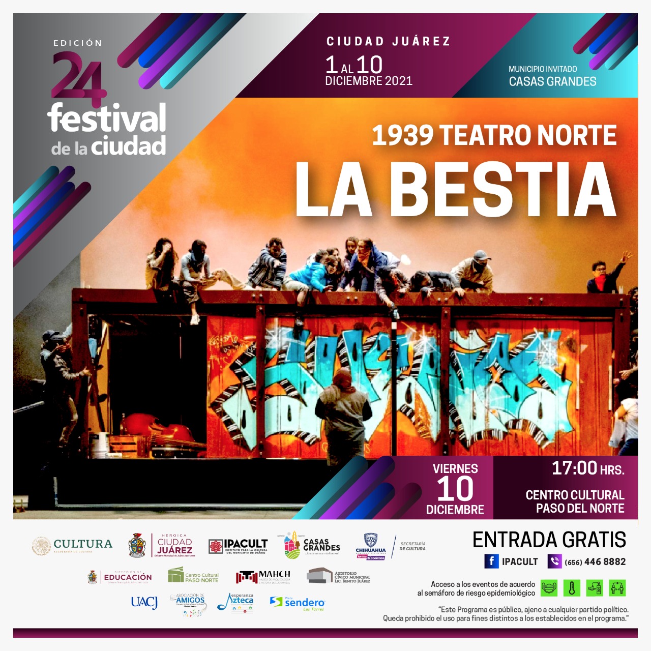 Esta obra con acceso gratuito y limitado por el Semáforo de Salud, se presentará el viernes 10 a las 7:00 de la noche, en el Teatro Víctor Hugo Rascón Banda, del Centro Cultural Paso del Norte.