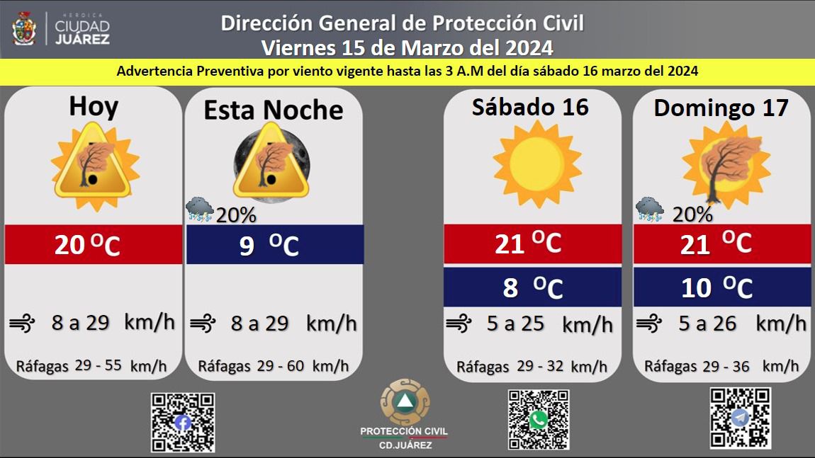 Se informa que para hoy se esperan fuertes ráfagas de viento que alcanzarán los 60 kilómetros por hora, en tanto que la velocidad del viento durante el día oscilará entre 29 a 60 kilómetros por hora.