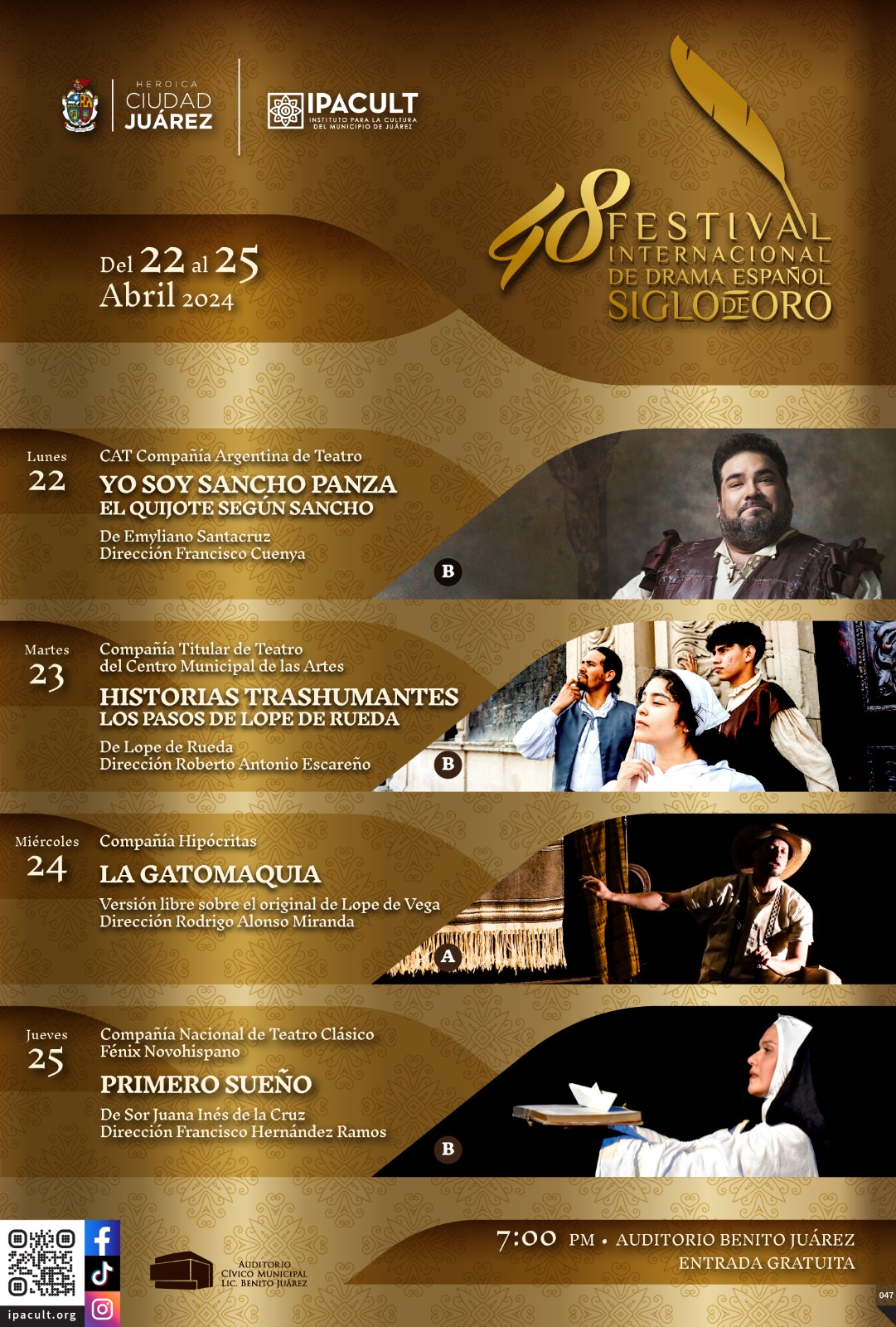 El espectáculo teatral Festival de Drama Español Siglo de Oro, en su cuadragésima octava edición, se estará presentando de forma gratuita del 22 al 25 de abril en el Auditorio Cívico Benito Juárez. Todas las funciones serán a las 7:00 de la tarde.