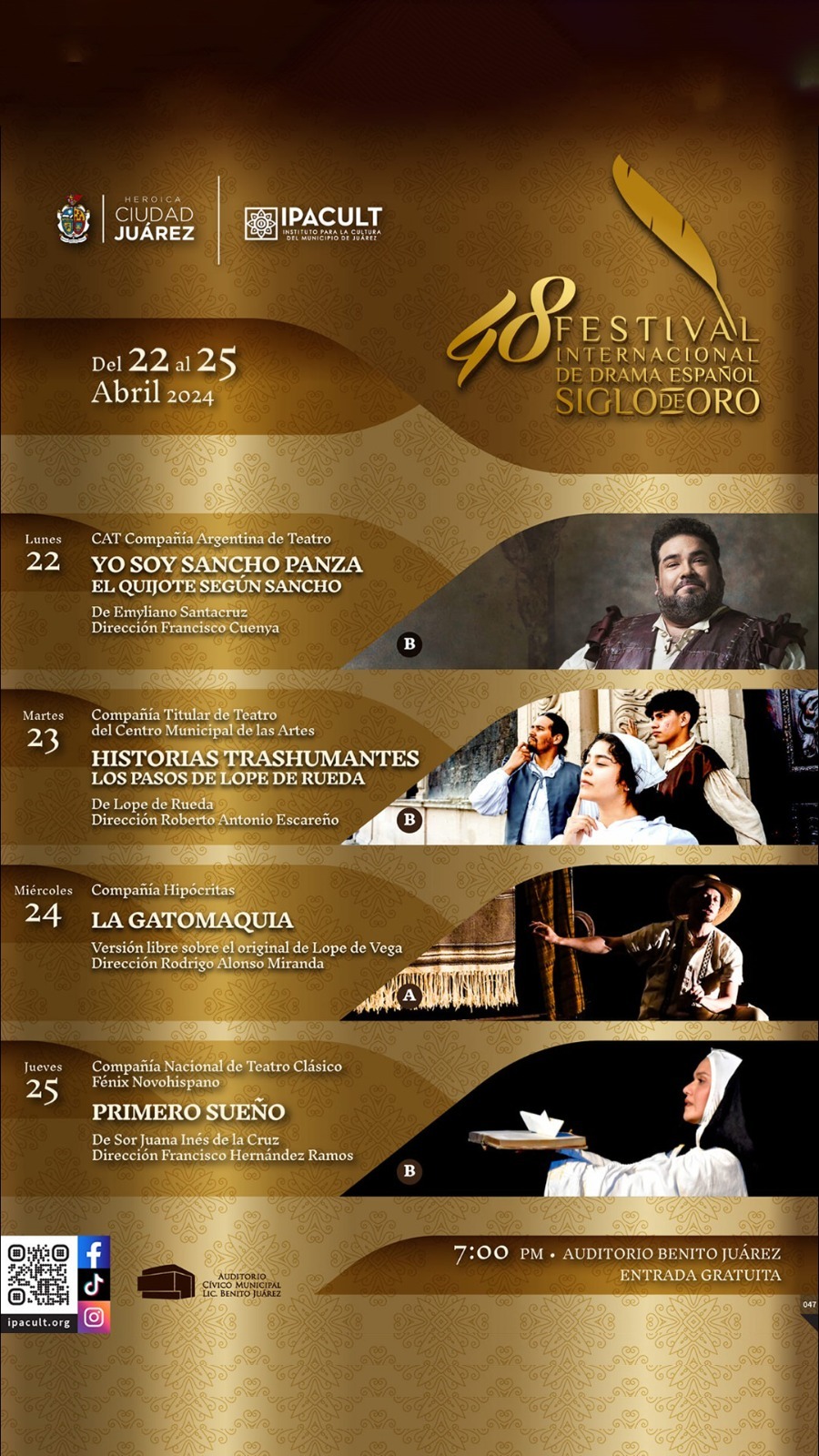 La espera terminó, después de un año regresa el Festival de Drama Español Siglo de Oro, en esta ocasión a las instalaciones del Auditorio CÃvico Benito Juárez, en donde todas las presentaciones serán de carácter gratuito.