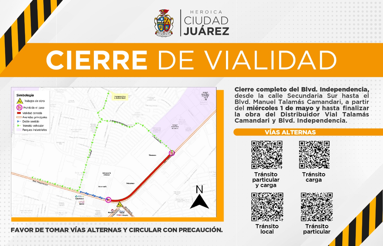 Con la finalidad de continuar con las obras del distribuidor vial Talamás-Independencia, a partir de este miércoles la Coordinación General de Seguridad Vial desviará el tráfico proveniente del bulevar Independencia hacía la calle Secundaria Sur, para continuar por la calle Francisco Bocanegra y luego la calle Durango y finalmente incorporarse a Talamás Camandari con rumbo hacia el poniente.