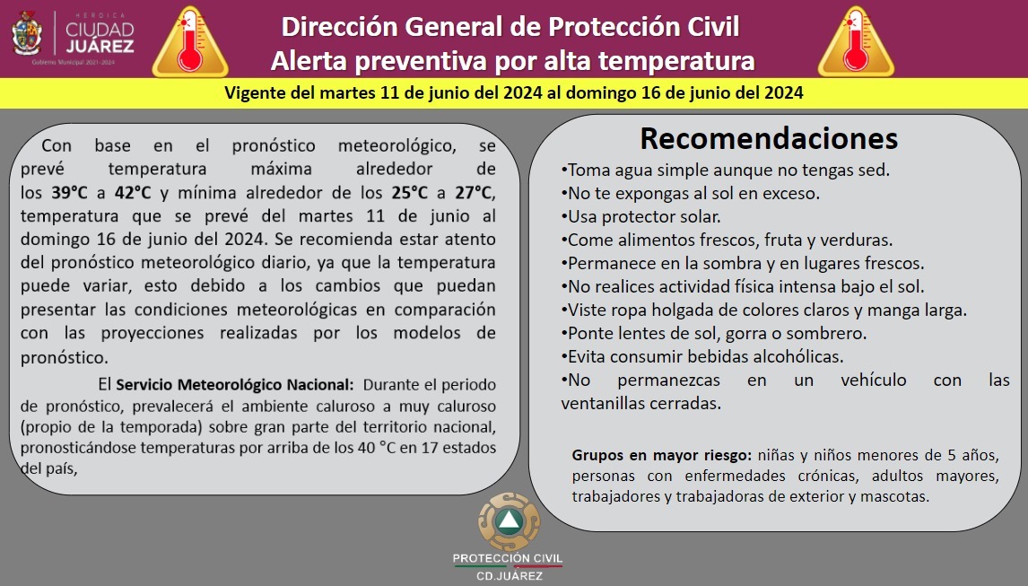 La Dirección General de Protección Civil, con base en el pronóstico meteorológico, emite una alerta preventiva debido a las altas temperaturas que se registrarán a partir de este martes 11 de junio hasta el domingo 16, ya que se espera que el termómetro registre temperaturas máximas de 39 a 42 grados Celsius.