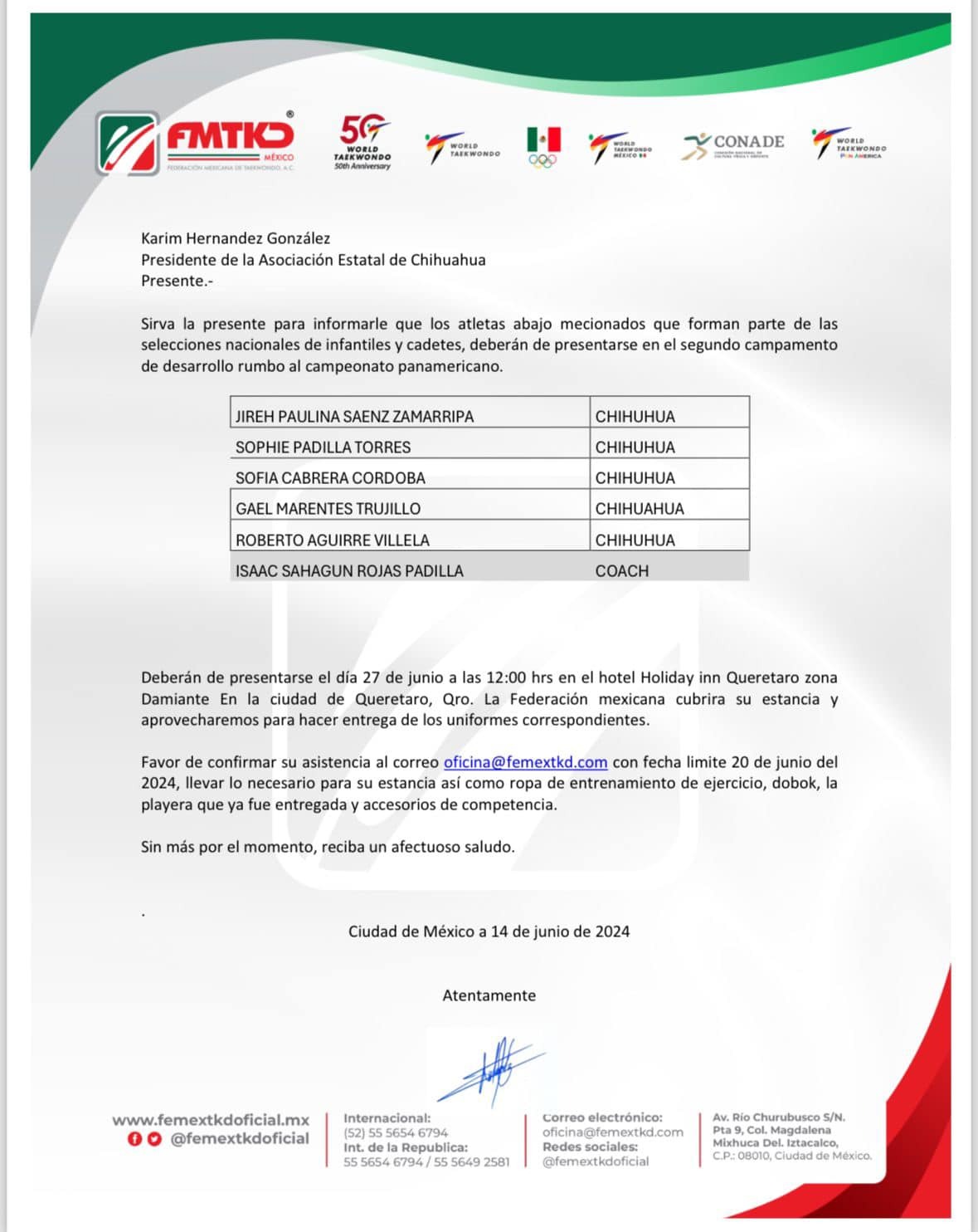 Jorge Amaya, presidente de la Liga Municipal de Taekwondo, agradeció el apoyo del Presidente Municipal, Cruz Pérez Cuéllar, a través del Instituto Municipal de Cultura Física y Deporte para llegar equipados y motivados a la competencia.