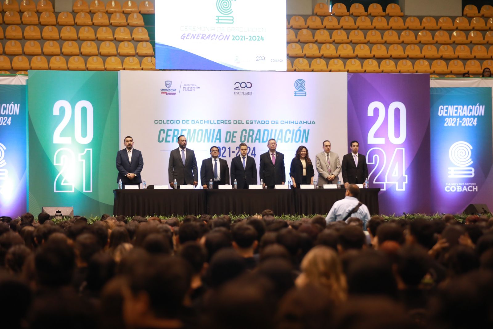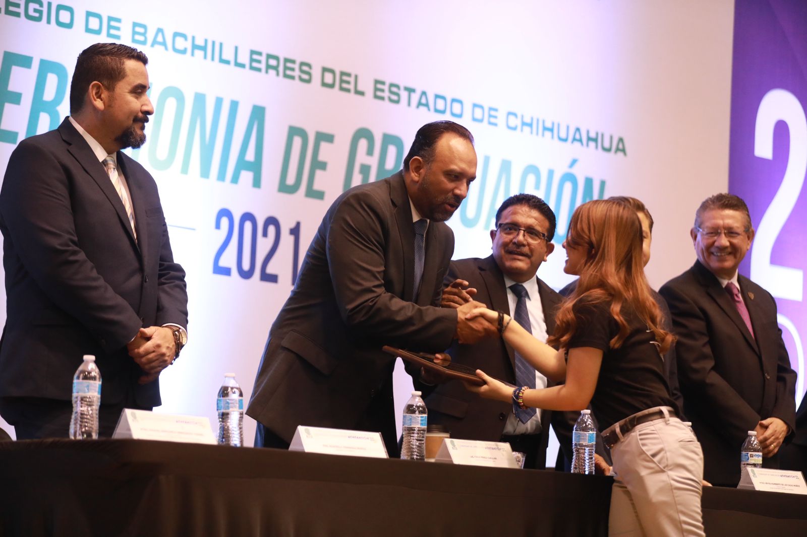 El director general del Colegio de Bachilleres del Estado de Chihuahua, Reyes Humberto De las Casas Muñoz, felicitó a los padres de familia por el apoyo que le brindaron a sus hijos para que siguieran estudiando y animó a los graduandos a continuar su vocación integral, con la cual fueron formados en sus respectivos planteles.