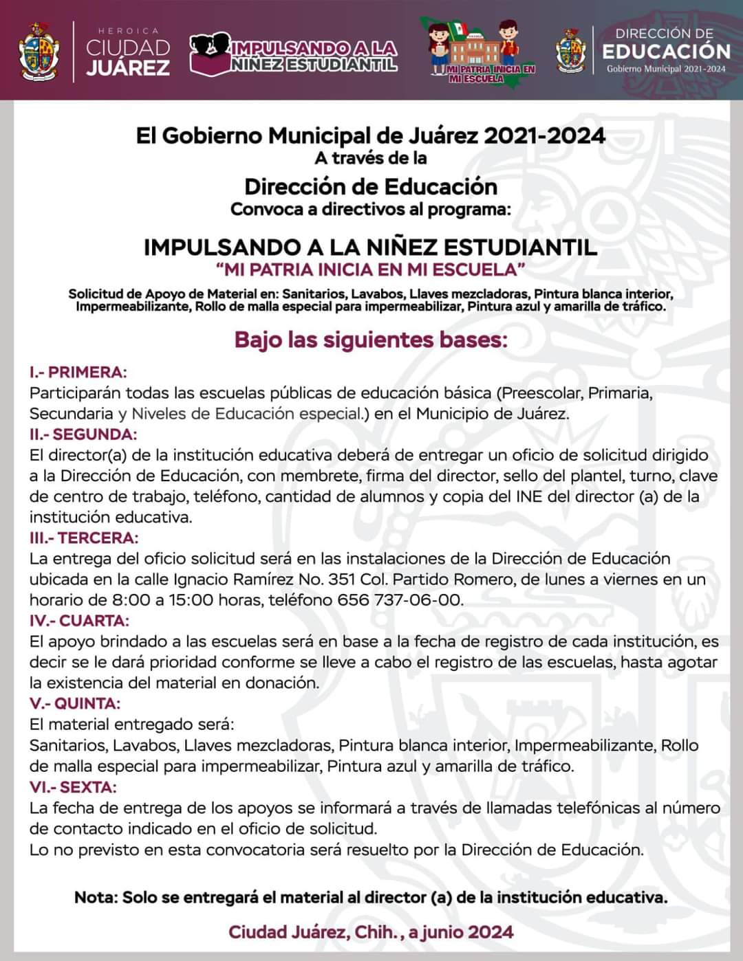 El Gobierno Municipal, a través de la Dirección de Educación, invita a las escuelas públicas de la ciudad a participar en el programa "Mi Patria Inicia en mi Escuela", que tiene como objetivo apoyar con material para mejora de los planteles.
