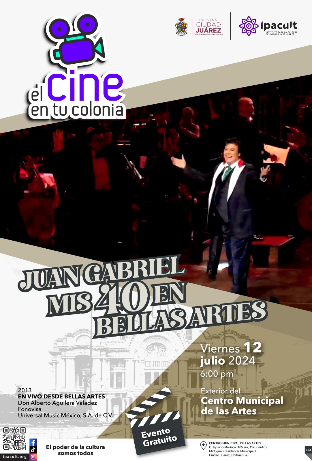 Como parte del programa "El cine en tu colonia", el Instituto para la Cultura del Municipio de Juárez (IPACULT), encabezado por Myrna Judith Barajas Martínez, invita a la ciudadanía a disfrutar de la exhibición del icónico concierto “Juan Gabriel: Mis 40 en Bellas Artes”.