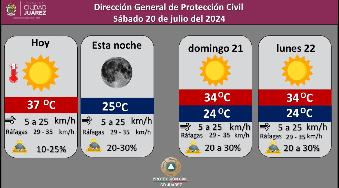 La Dirección General de Protección Civil, con base en informes del Servicio Meteorológico Nacional, pronostica un 30 por ciento de probabilidad de lluvia para este sábado, con una temperatura máxima de 37 grados Celsius, mientras que la mínima será de 25 °C para esta noche.