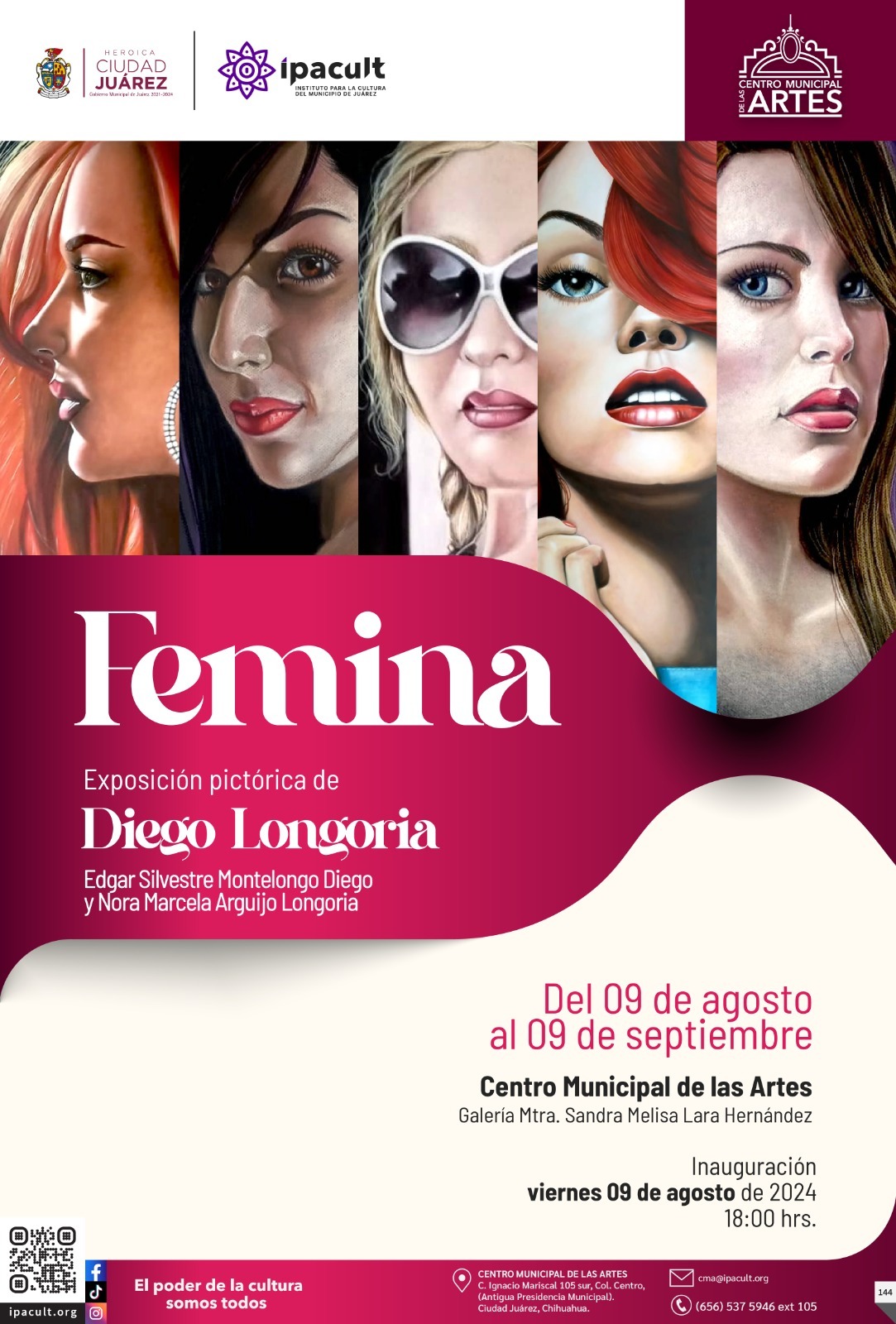 El Instituto para la Cultura del Municipio de Juárez (IPACULT) invita a la ciudadanía a disfrutar de la exposición pictórica “Fémina” de la artista Nora Marcela Arguijo Longoria, en honor a Edgar Silvestre Montelongo Diego, la cual se exhibirá en la galería "Melisa Lara Hernández" del Centro Municipal de las Artes (CMA).