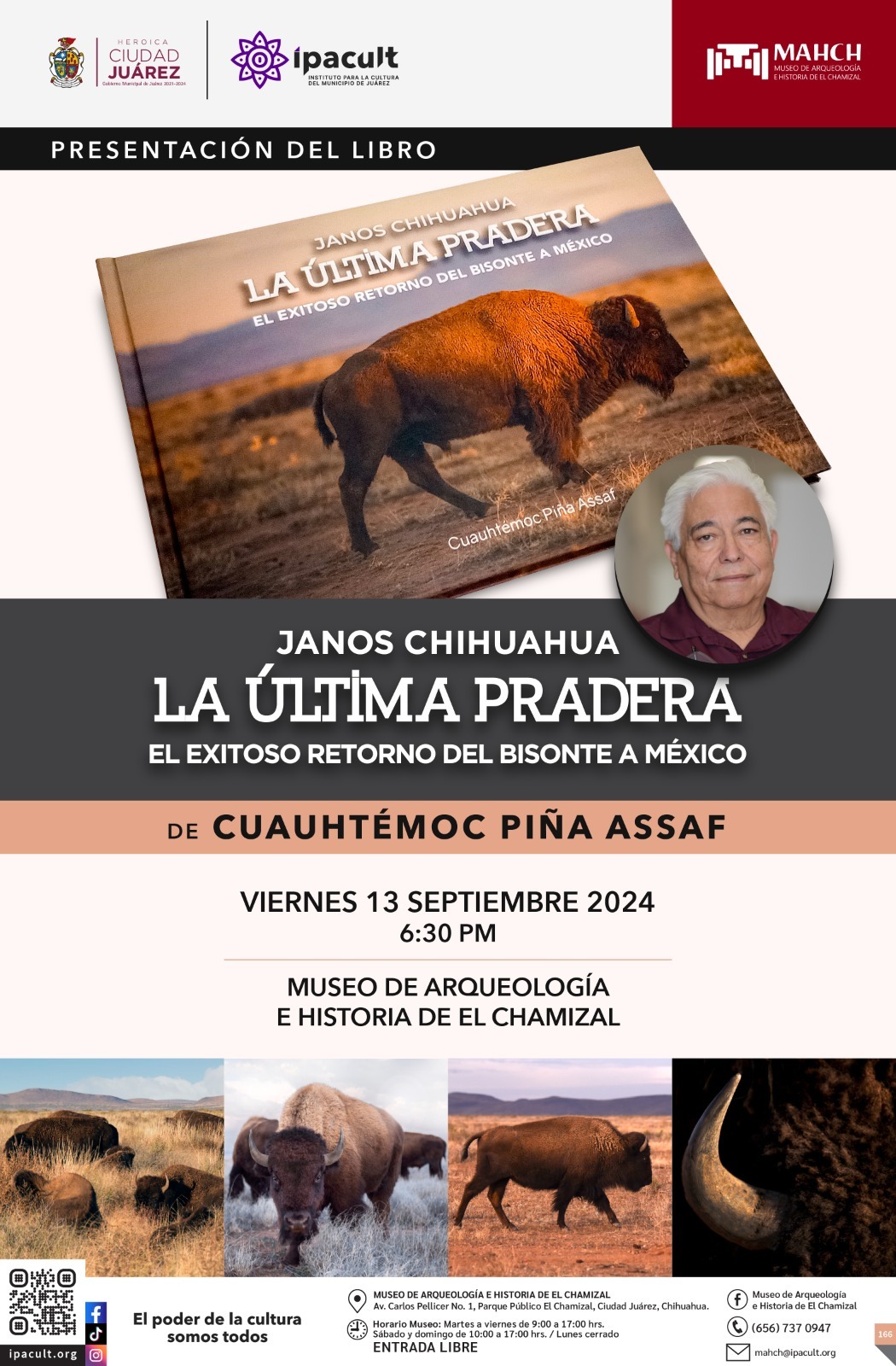 El Instituto para la Cultura del Municipio de Juárez (IPACULT) invita a la presentación del libro “La Última Pradera: El Exitoso Retorno del Bisonte a México”, que se llevará a cabo el próximo viernes 13 de septiembre a las 6:30 de la tarde en el Museo de Arqueología e Historia de El Chamizal (MAHCH).