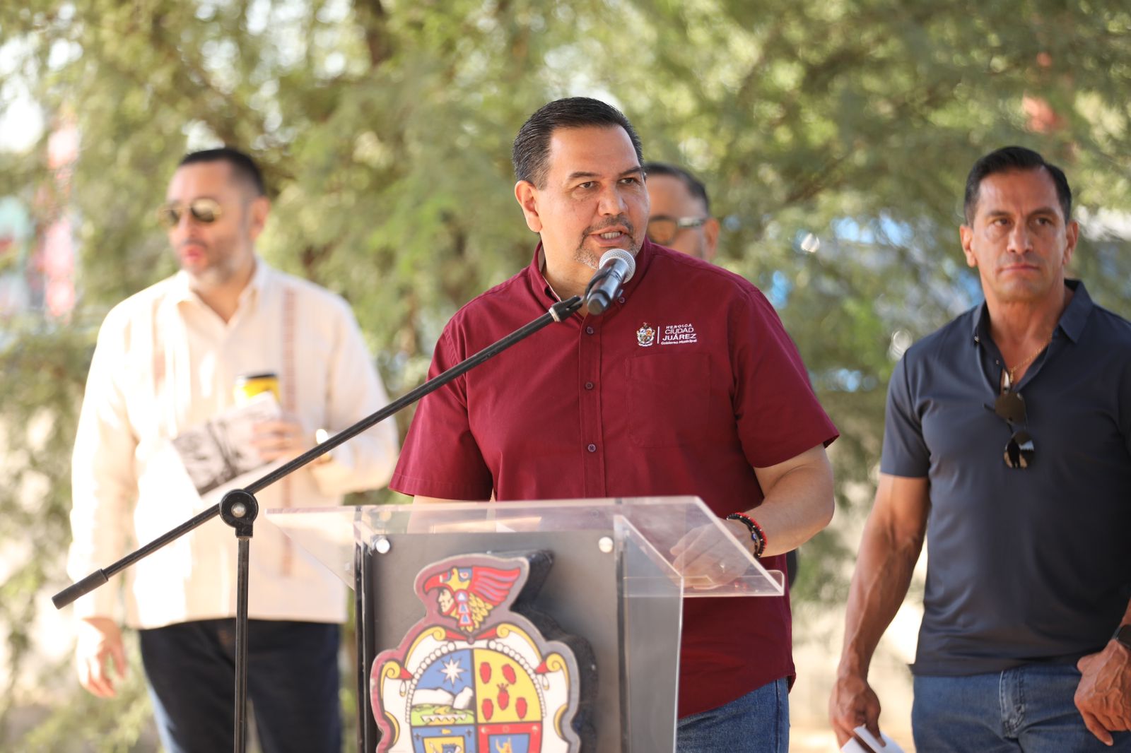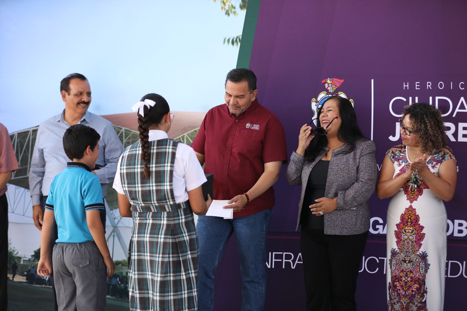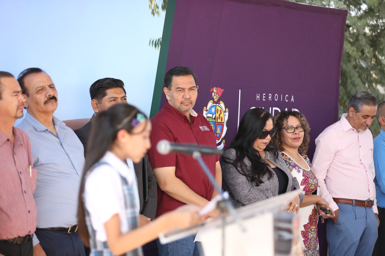 Durante la ceremonia, el Presidente Municipal Cruz Pérez Cuéllar destacó que estos apoyos son parte del compromiso de su administración para mejorar el entorno escolar de la niñez.