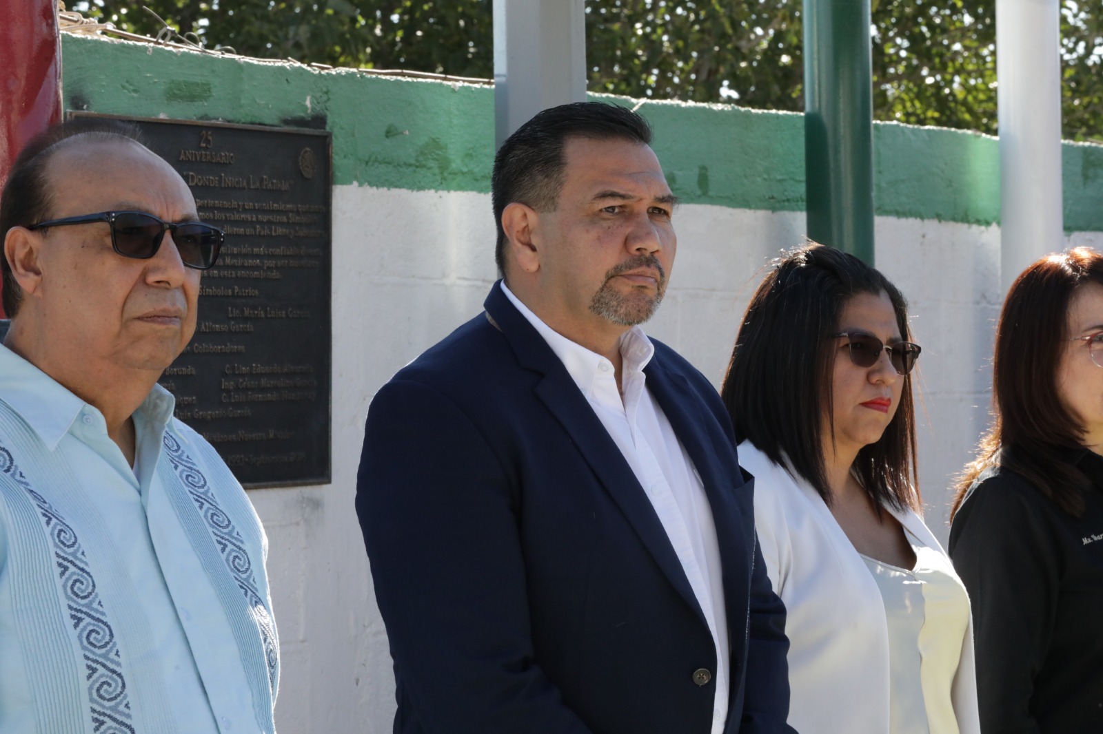El Presidente Municipal, Cruz Pérez Cuéllar, encabezó hoy los honores a la bandera realizados en la Plaza Cívica Donde Inicia la Patria, situada en una vivienda particular sobre la avenida De los Aztecas.