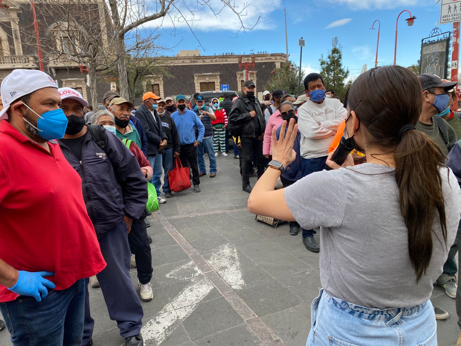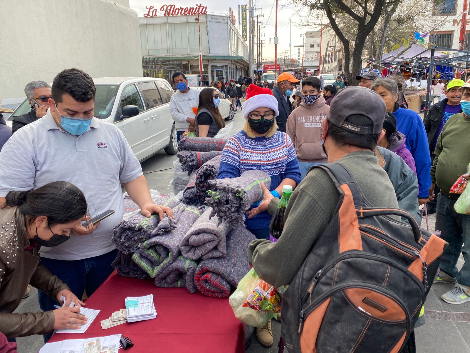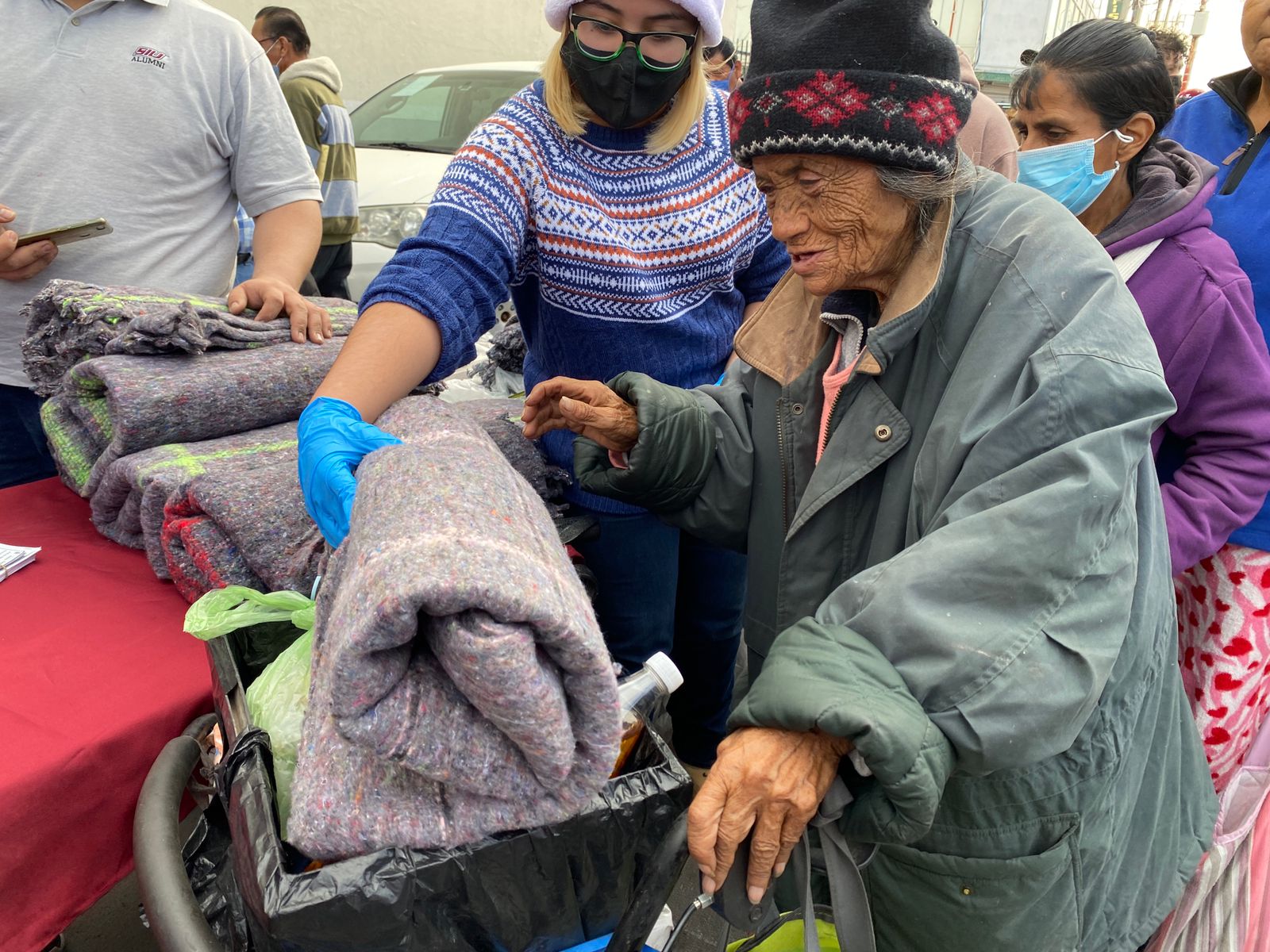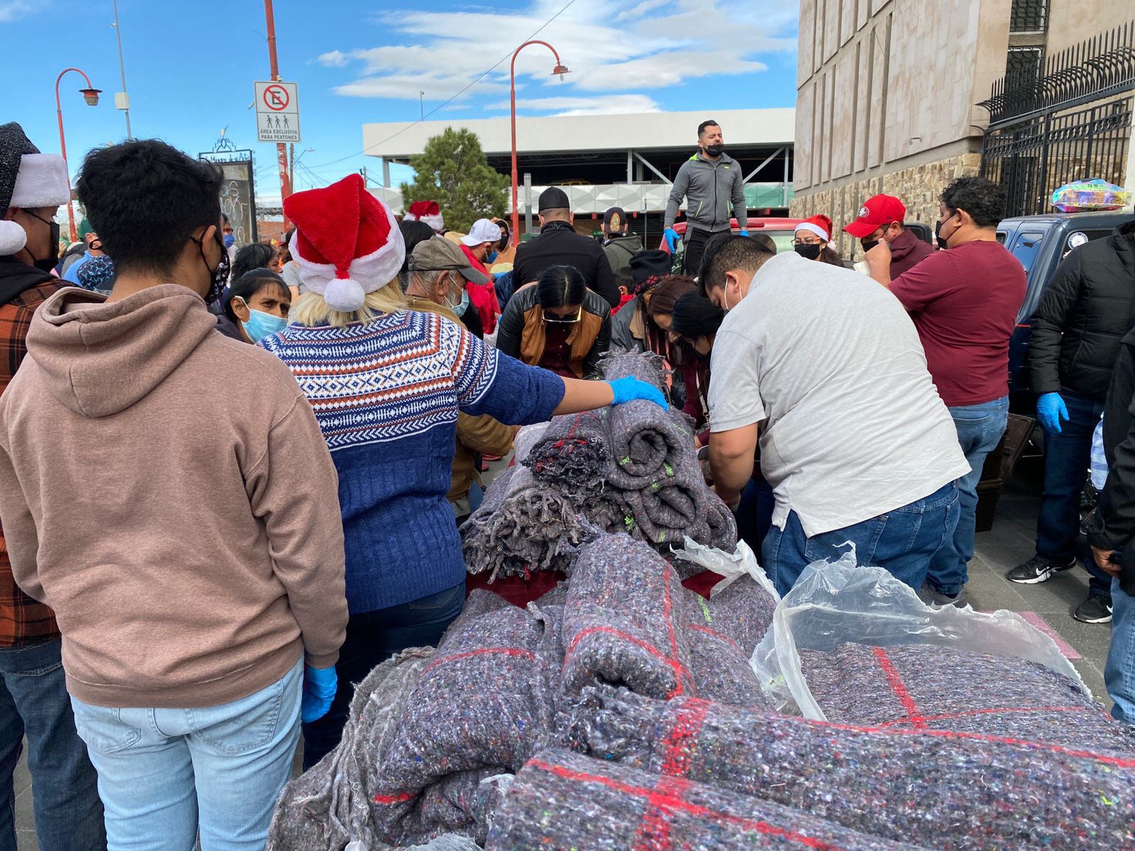 Personal de la Dirección de Desarrollo Social, en colaboración con la agrupación denominada Pollotón, entregaron hoy cobijas y alimentos para personas en situación de calle y adultos mayores que acudieron al Centro Histórico de la ciudad.