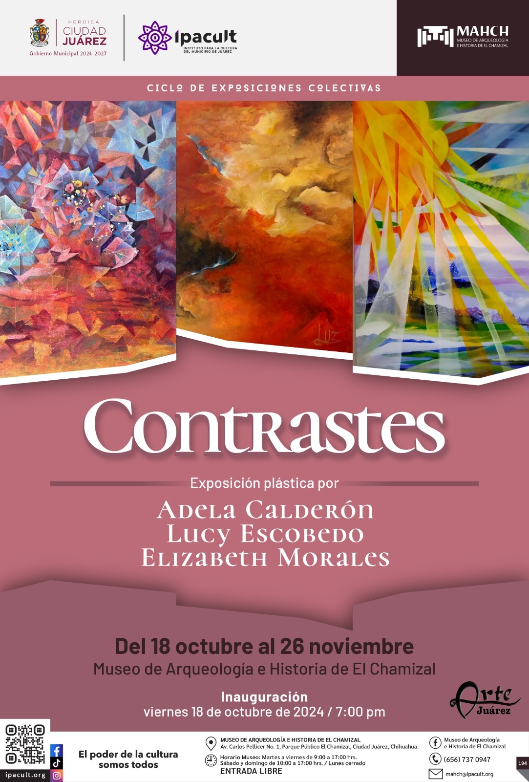 El Instituto para la Cultura del Municipio de Juárez (IPACULT) invita a la ciudadanía a la inauguración de la exposición plástica “Contrastes”, organizada por el Colectivo Arte Juárez, que tendrá lugar el próximo viernes 18 de octubre en el Museo de Arqueología e Historia de El Chamizal (MAHCH).