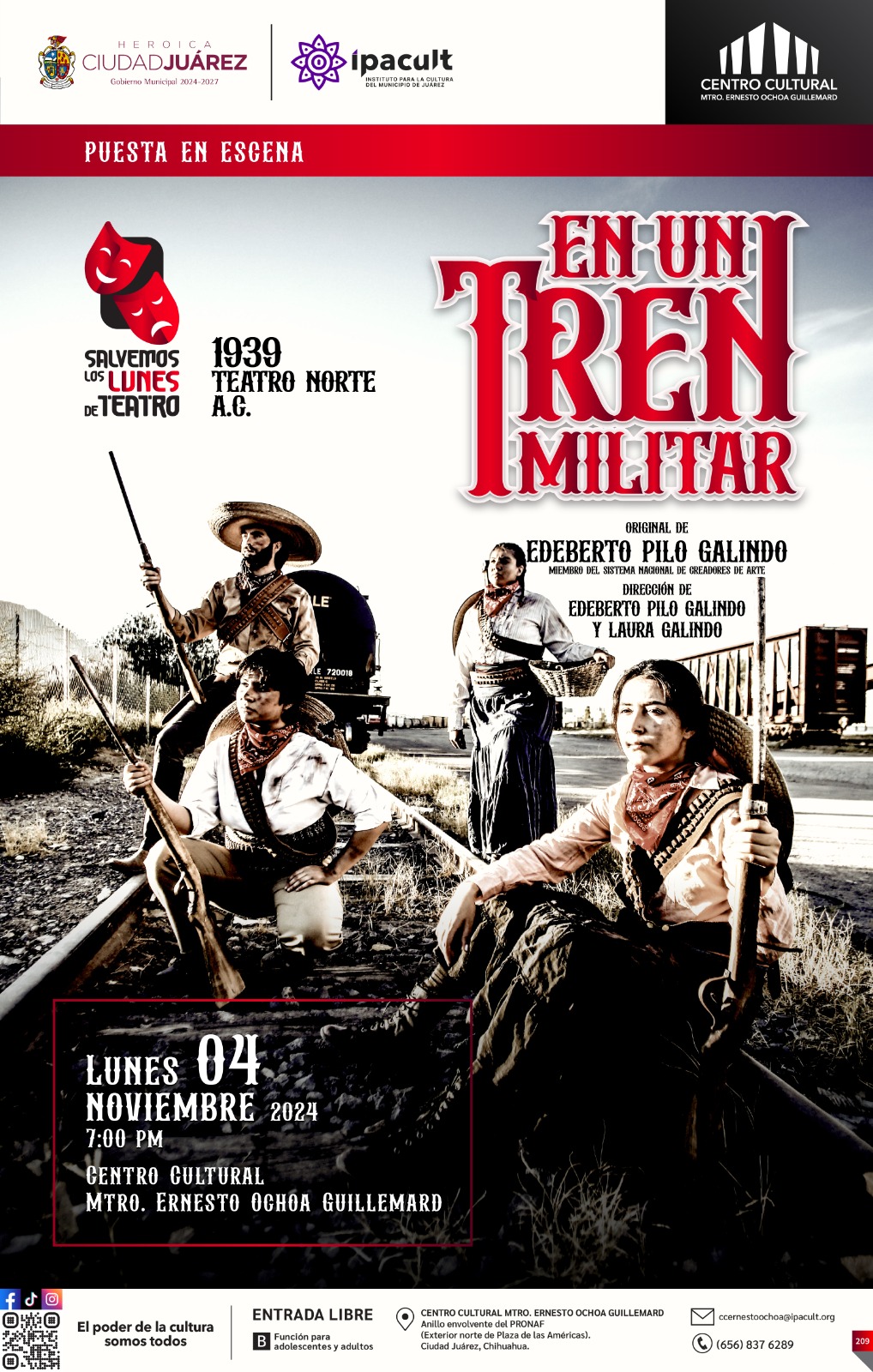 El Instituto para la Cultura del Municipio de Juárez (IPACULT) extiende una invitación a la comunidad juarense para asistir a la presentación de la obra “En un tren militar”, una puesta en escena que se llevará a cabo el próximo lunes 4 de noviembre a las 7:00 de la tarde en el Centro Cultural Ernesto Ochoa Guillemard.