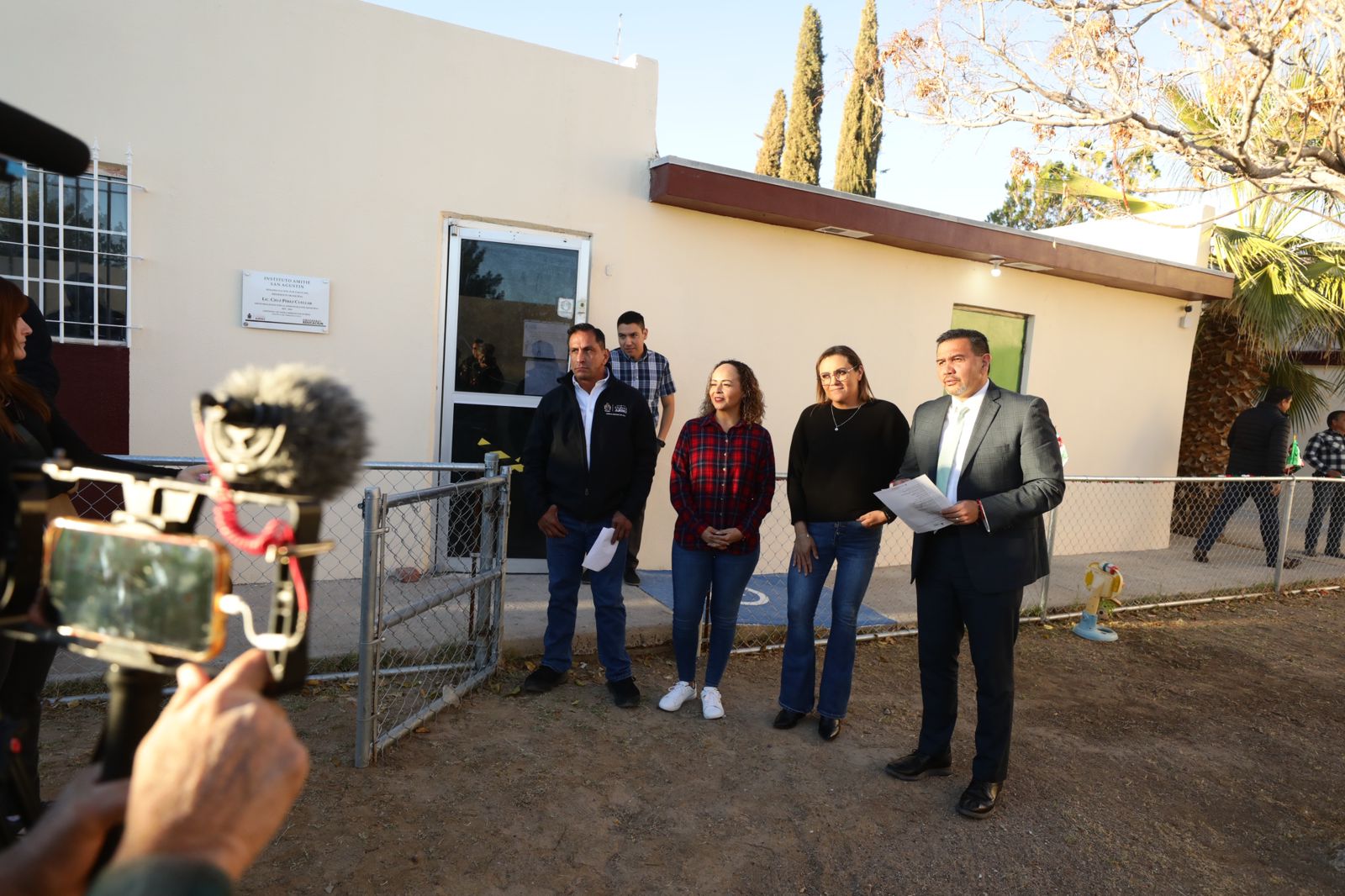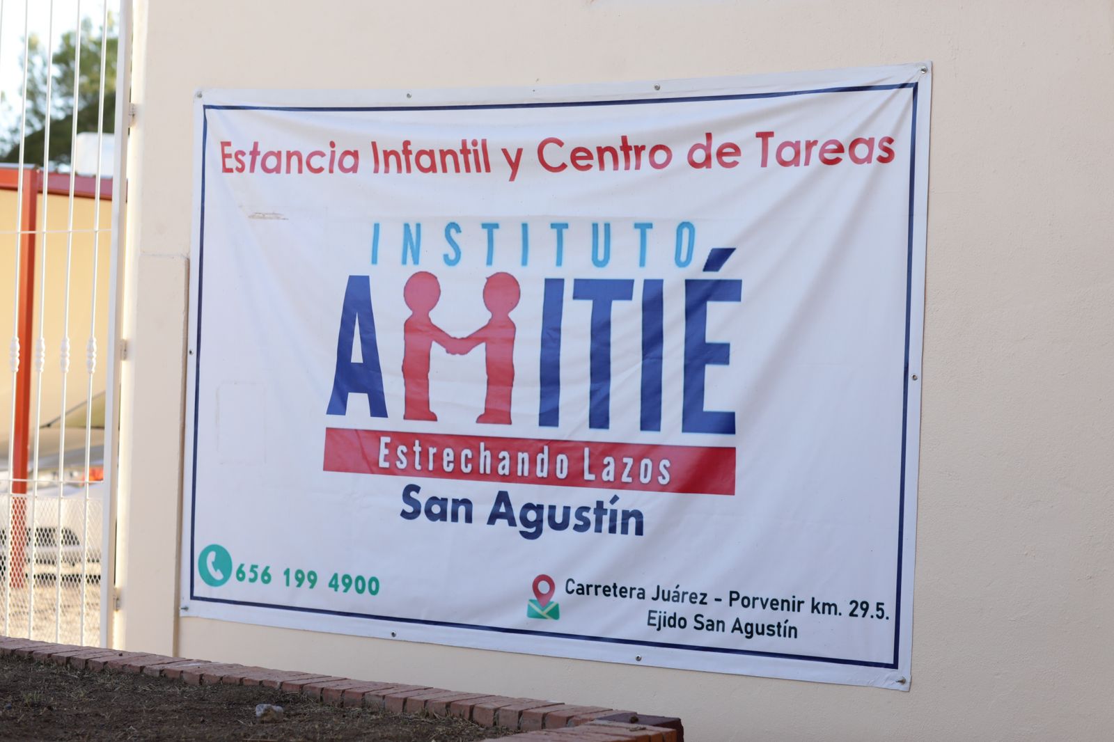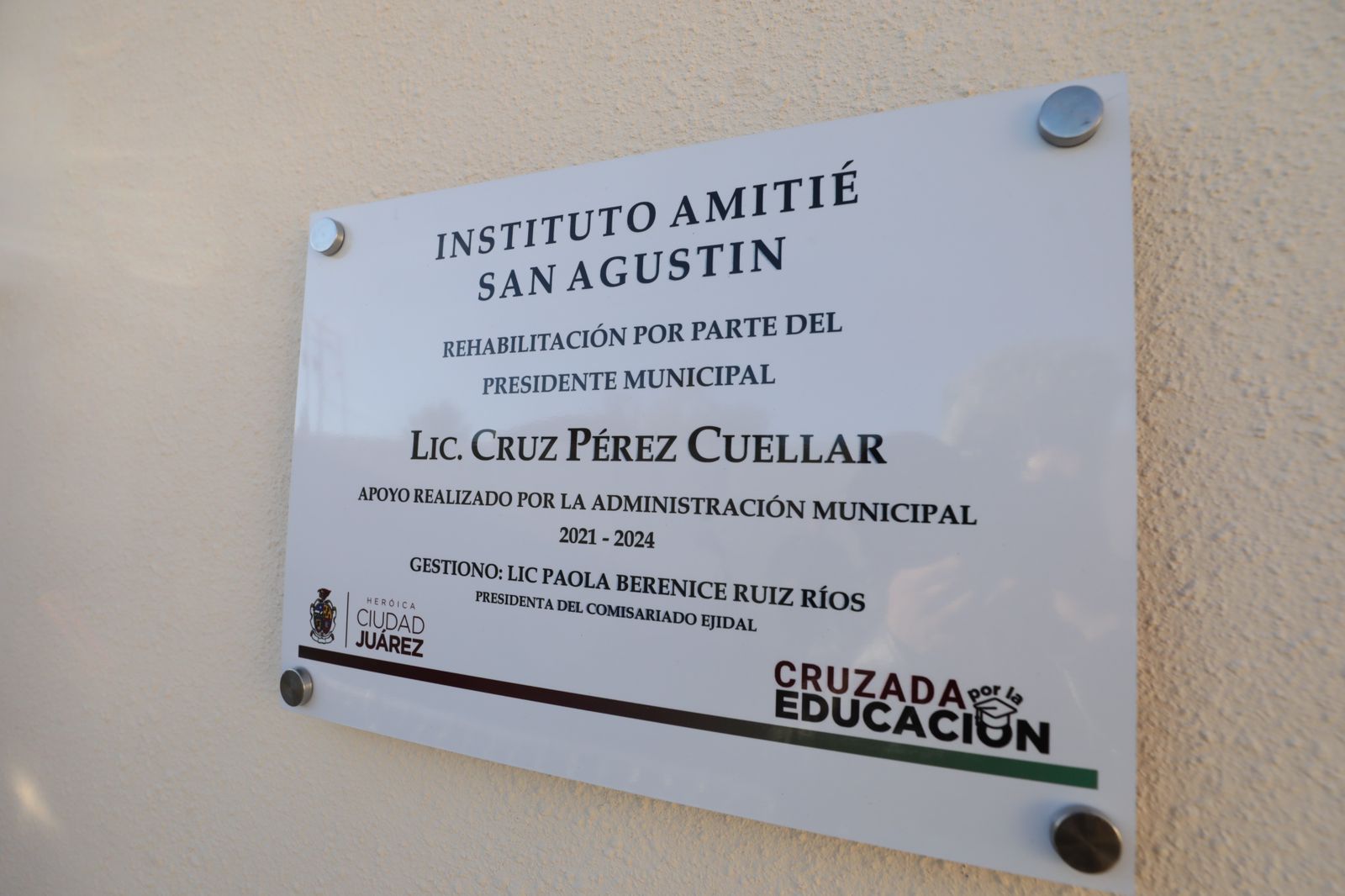 El Presidente Municipal, Cruz Pérez Cuéllar, acudió al ejido San AgustÃn, en el Valle de Juárez, para entregar las obras de rehabilitación del Centro de Atención Infantil (CAI) Amitié, espacio que ofrece el servicio de guarderÃa gratuita en beneficio de los infantes del poblado.