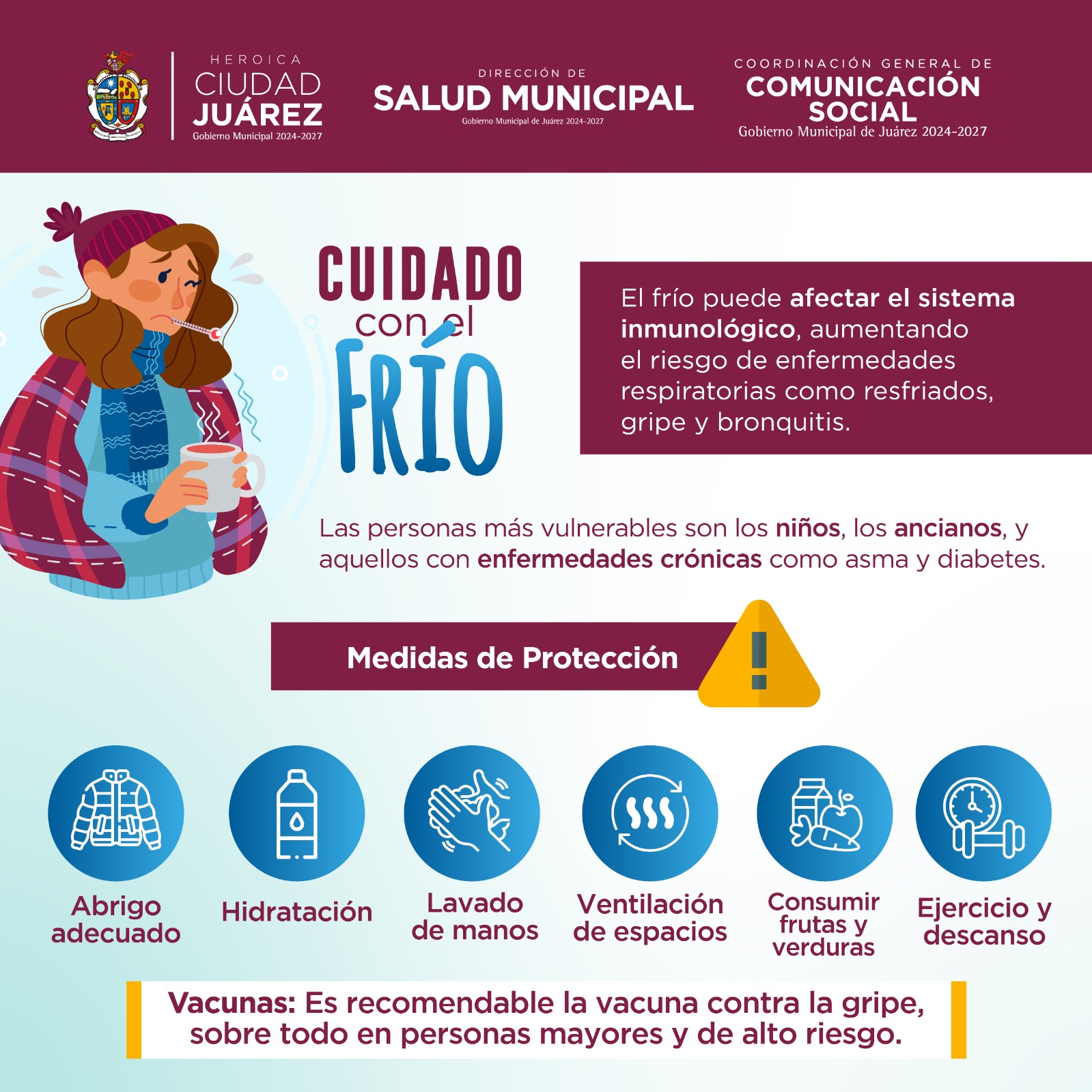 La Dirección de Salud del Gobierno Municipal, hace un llamado a la comunidad juarense para cuidar de la salud de las personas vulnerables a padecer alguna complicación médica derivada de las bajas temperaturas.