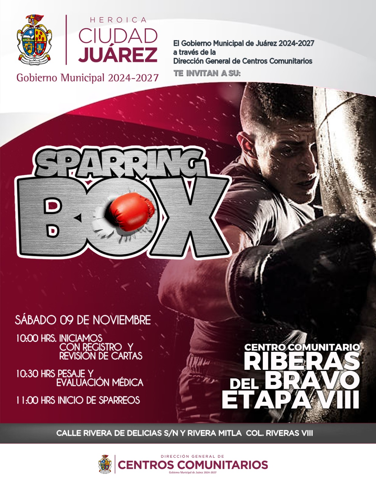 Este sábado 9 de noviembre, el Gobierno Municipal de Juárez, a través de la Dirección General de Centros Comunitarios, organiza el evento Sparring Box en el Centro Comunitario Riberas del Bravo Etapa VIII, ubicado en la calle Rivera de Delicias S/N y Rivera Mitla.