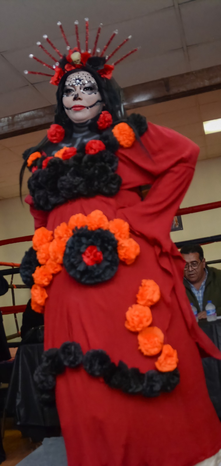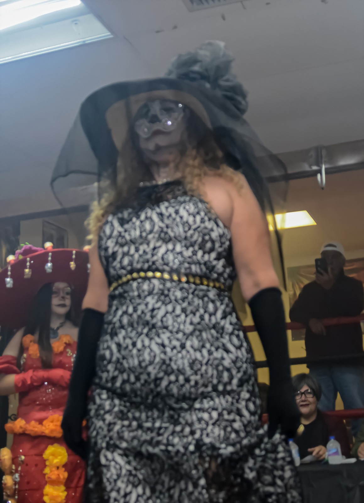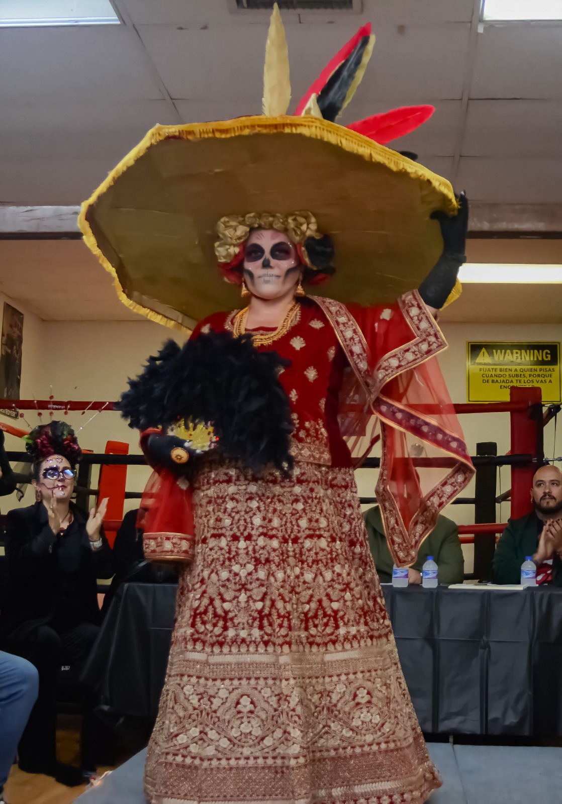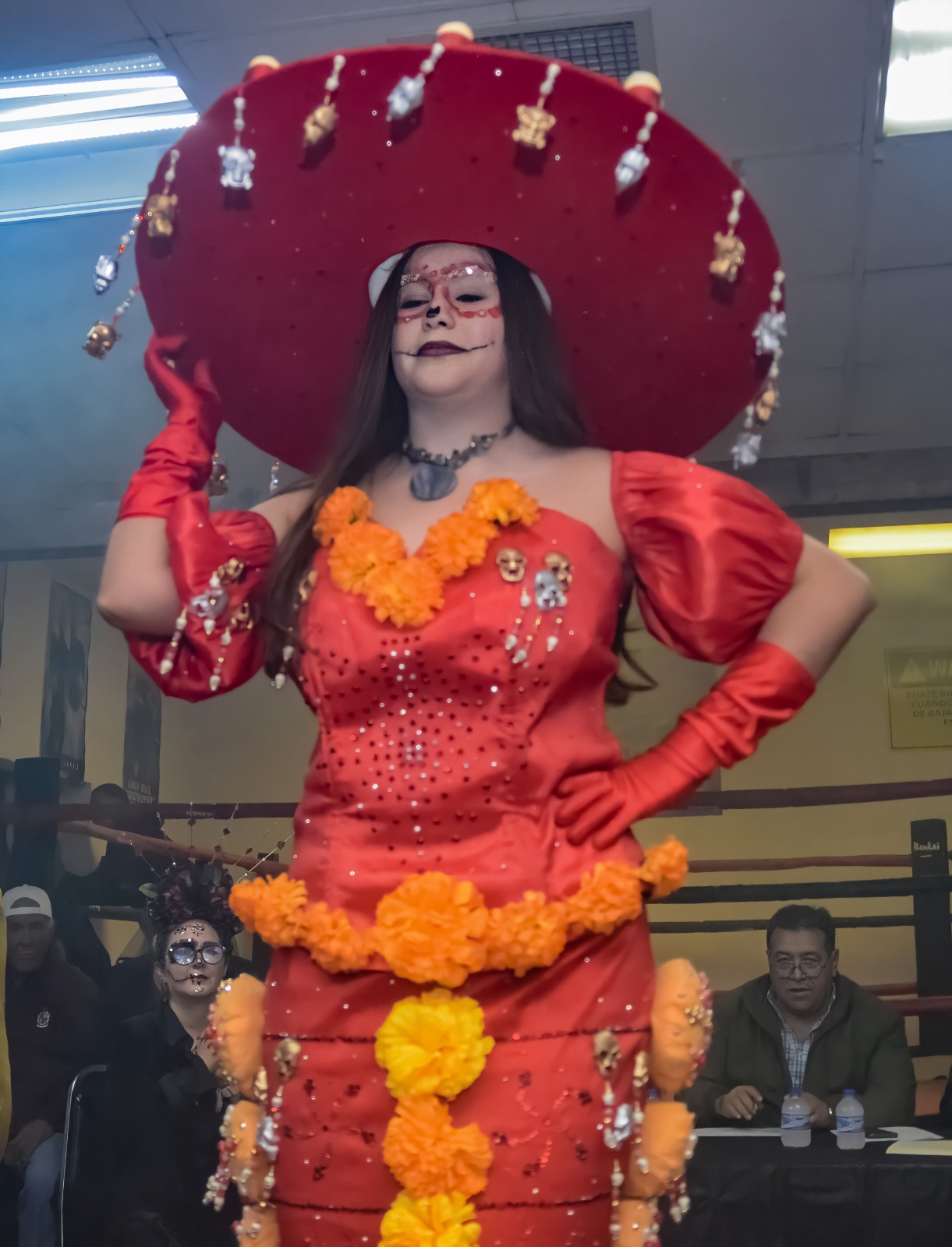 Quince participantes desfilaron por una pasarela especialmente decorada, destacándose un inmenso altar dedicado a San Antonio, con fotografías de seres queridos en honor al Día de Muertos. Los concursantes, alumnos de distintos talleres del centro comunitario, sorprendieron al público con su creatividad y sus elaborados atuendos, confeccionados artesanalmente con detalles únicos y dignos de manos profesionales. Algunos vestuarios fueron hechos con hojas de tamal y aplicaciones de chiles, otros con papel crepé y luces, incluso algunos incluían altares en la cola del vestido. La mayoría complementó sus trajes con sombreros, penachos, coronas, flores, calaveras, y un maquillaje extraordinario que dejó a todos impactados.