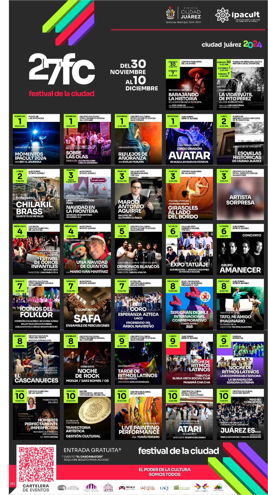 El Instituto para la Cultura del Municipio de Juárez (IPACULT) anunció la programación de la edición número 27 del Festival de la Ciudad, una celebración que conmemora los 365 años de la fundación de Ciudad Juárez.