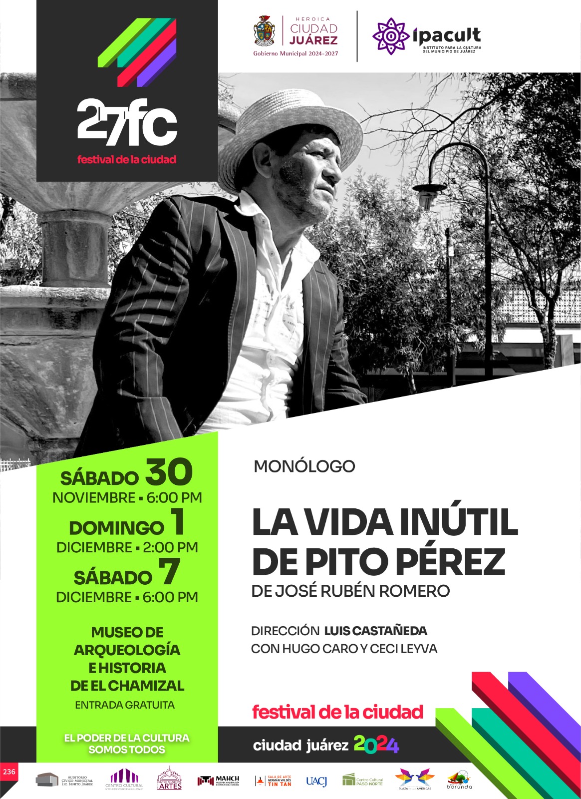 El Instituto para la Cultura del Municipio de Juárez (IPACULT) invita a la ciudadanía a disfrutar del monólogo “La vida inútil de Pito Pérez”, que formará parte de la edición 27 del Festival de la Ciudad, con motivo de los 365 años de la fundación de Ciudad Juárez y que busca ofrecer a los asistentes una experiencia única en el Museo de Arqueología e Historia de El Chamizal (MAHCH).