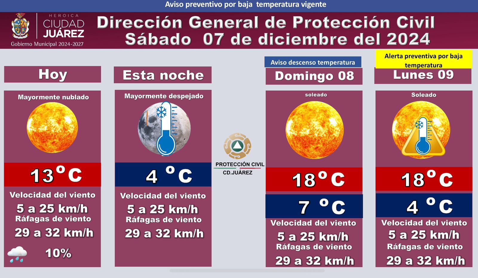La Dirección General de Protección Civil de Ciudad Juárez ha emitido el pronóstico del clima para el sábado 7 de diciembre de 2024 y los días siguientes, junto con una alerta preventiva vigente por bajas temperaturas.