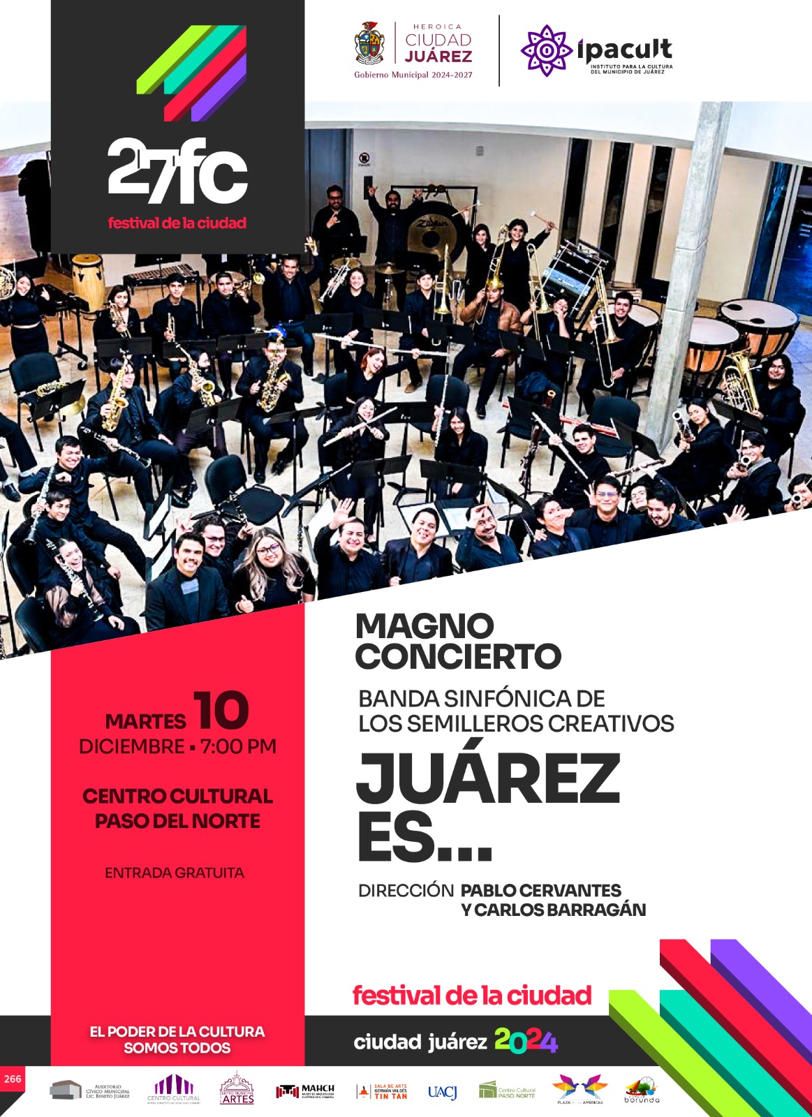 La edición 27 del Festival de la Ciudad llegará a su fin este martes con el magno concierto titulado “Juárez es…”, a cargo de la Banda Sinfónica de los Semilleros Creativos, bajo la dirección de Pablo Cervantes y Carlos Adrián Barragán Contreras y que se llevara a cabo a las 7:00 de la tarde en el Centro Cultural Paso del Norte (CCPN).