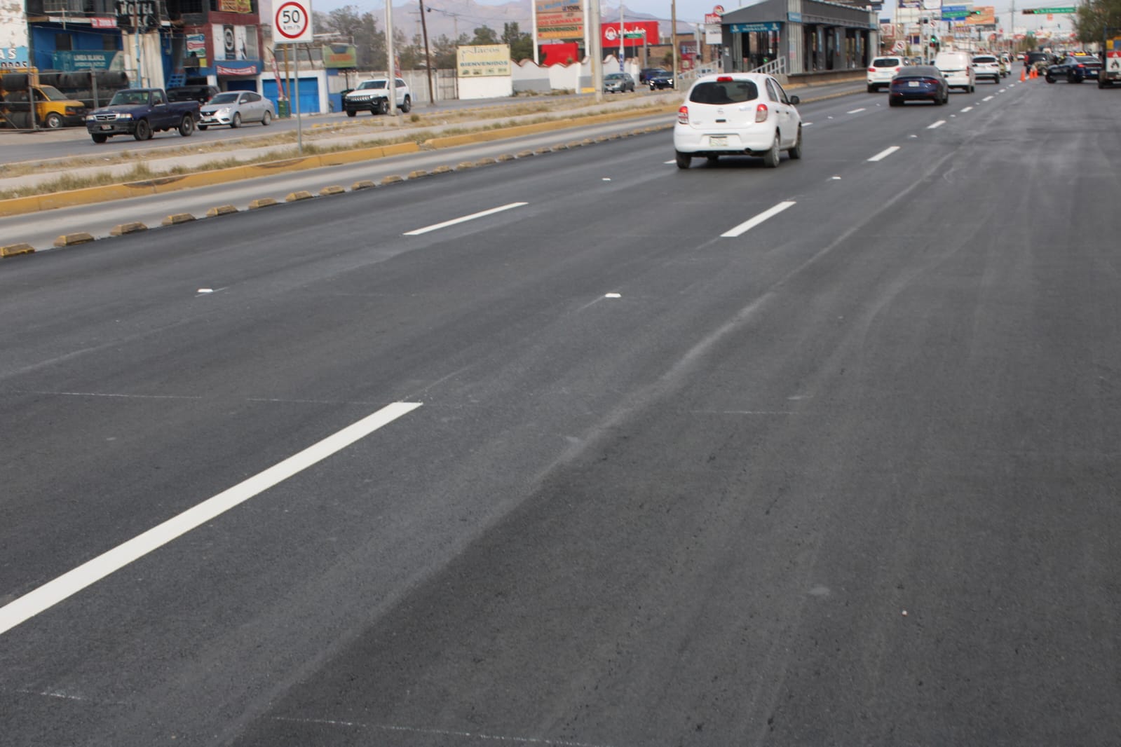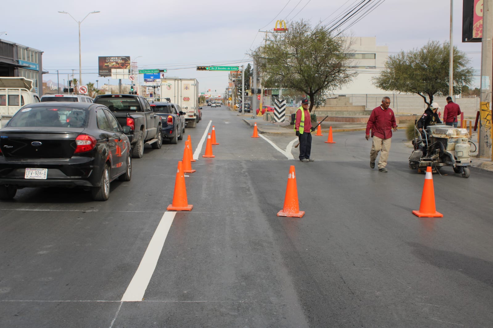 Asimismo, pero en otro sector de la ciudad, se pintaron líneas con pintura amarilla en el eje central de los carriles sobre la calle Valle del Sol, en el tramo que va del bulevar Francisco Villarreal Torres hasta la calle Tres Cantos.