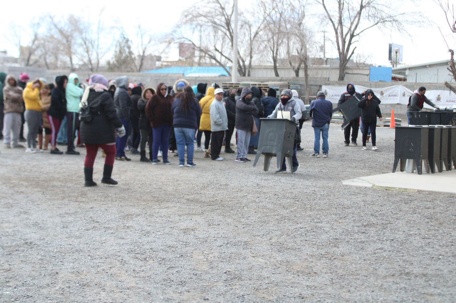 Indicó que este día, a pesar de la baja temperatura, las familias juarenses acudieron al llamado que les hicieron empleados de esta Dirección, quienes repartieron calentones de leña, para ayudarles a mitigar el frío intenso que se presenta en la localidad.