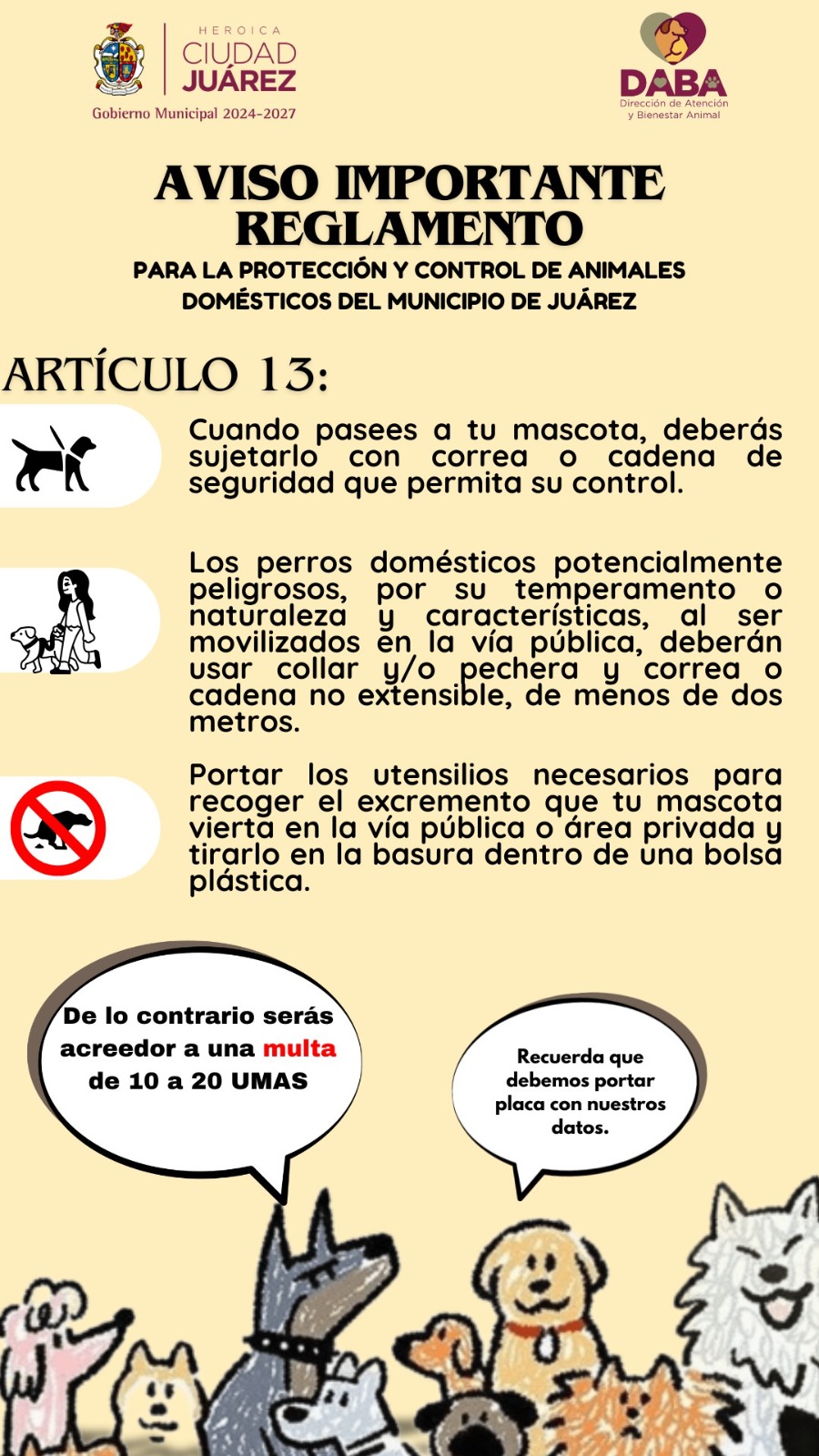 La Dirección de Atención y Bienestar Animal (DABA) emite algunos artículos del Reglamento para la Protección y Control de Animales Domésticos del Municipio de Juárez, con el propósito de que los juarenses las conozcan, cumplan con ellas y eviten sanciones.