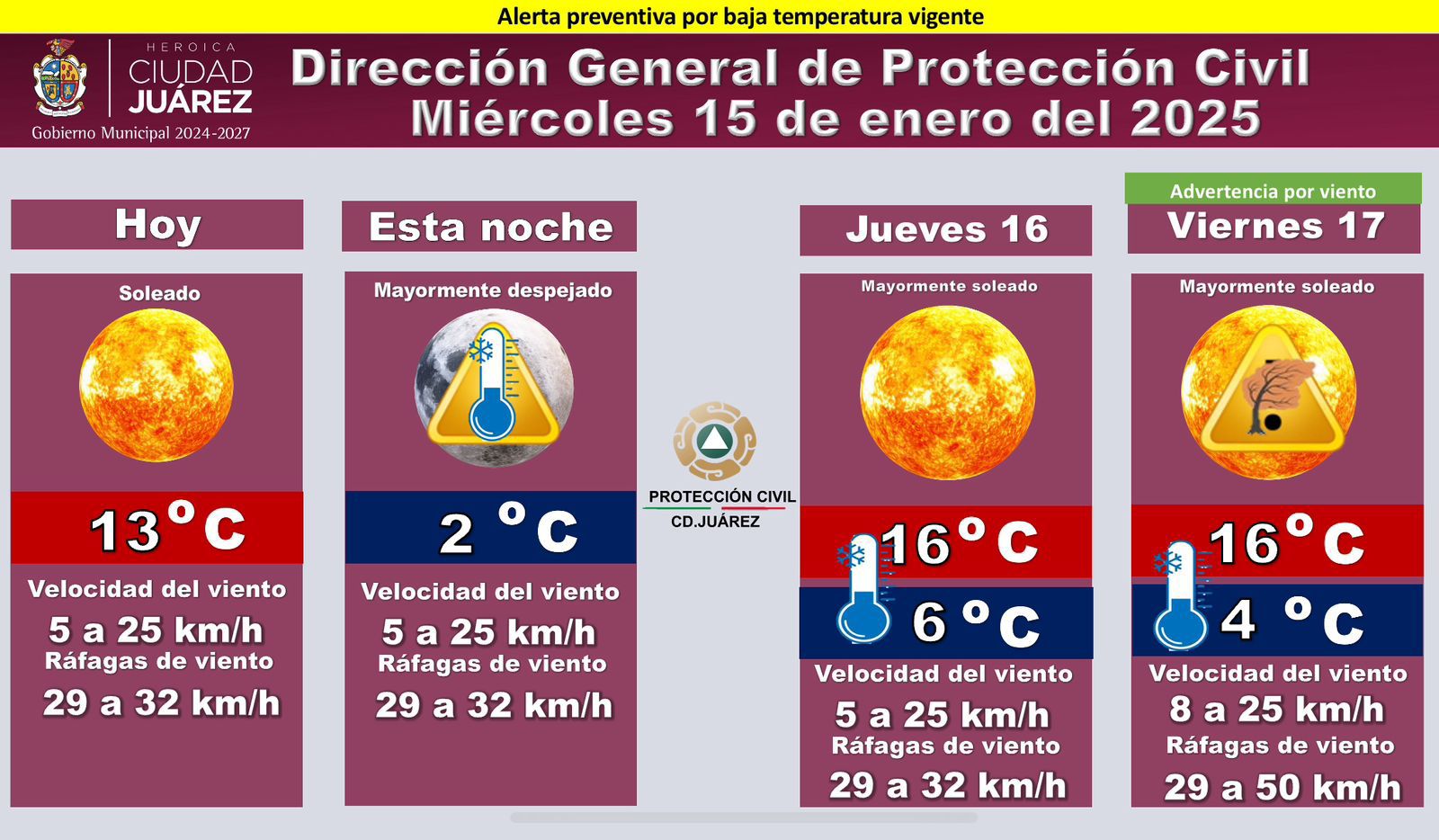 La Dirección General de Protección Civil informa sobre el pronóstico del clima para los días 15, 16 y 17 de enero de 2025, destacando una advertencia por vientos fuertes para el próximo viernes.
