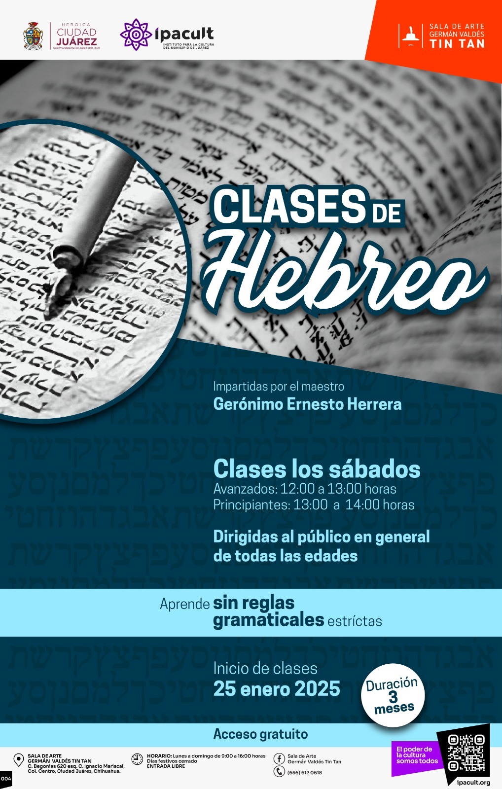 El Instituto para la Cultura del Municipio de Juárez (IPACULT) invita a la ciudadanía a las clases gratuitas de hebreo, dirigidas a principiantes y avanzados, que se llevarán a cabo en la Sala de Arte Germán Valdés "Tin Tan" a partir del próximo sábado 25 de enero.