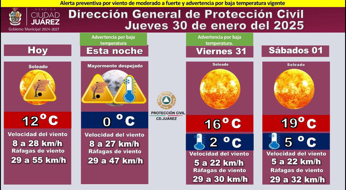 La Dirección General de Protección Civil de Ciudad Juárez informó sobre las condiciones climáticas para los próximos días, emitiendo una alerta preventiva por viento de moderado a fuerte y una advertencia por bajas temperaturas.