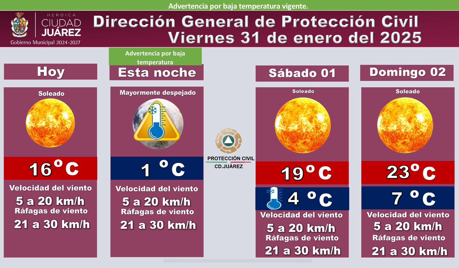 La Dirección General de Protección Civil de Ciudad Juárez dio a conocer el pronóstico del clima para los próximos días, señalando una advertencia por bajas temperaturas.