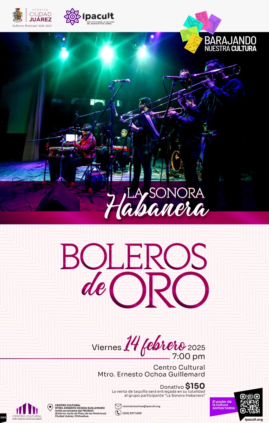 El Instituto para la Cultura del Municipio de Juárez (IPACULT), a través de su programa “Barajando nuestra cultura”, invita a la comunidad a disfrutar del concierto “Boleros de Oro”, a cargo de La Sonora Habanera, este próximo 14 de febrero a las 7:00 de la tarde en el Centro Cultural “Ernesto Ochoa Guillemard”.