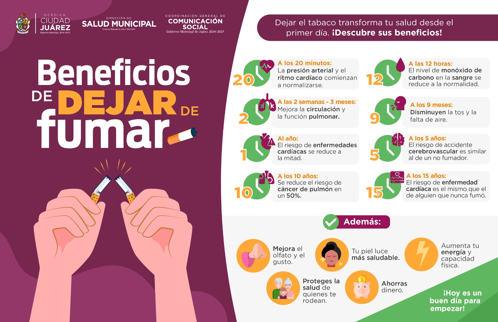 A medida que pasa el tiempo, los beneficios continúan, pero en un lapso de semanas a tres meses mejora la circulación y la función pulmonar, a los nueve meses disminuyen la tos y la falta de aire. Un año después de dejar de fumar, el riesgo de enfermedades cardíacas se reduce a la mitad, indicó.