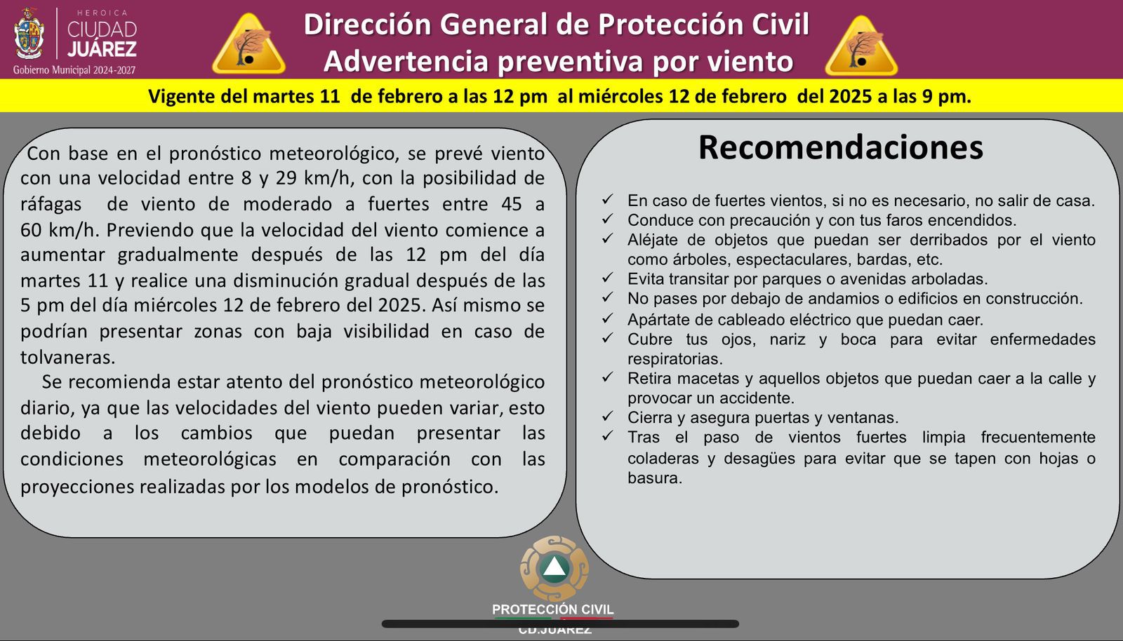La Dirección General de Protección Civil de Ciudad Juárez informa sobre una advertencia preventiva por viento, vigente desde el martes 11 de febrero a las 12:00 p.m. hasta el miércoles 12 de febrero de 2025 a las 9:00 p.m.