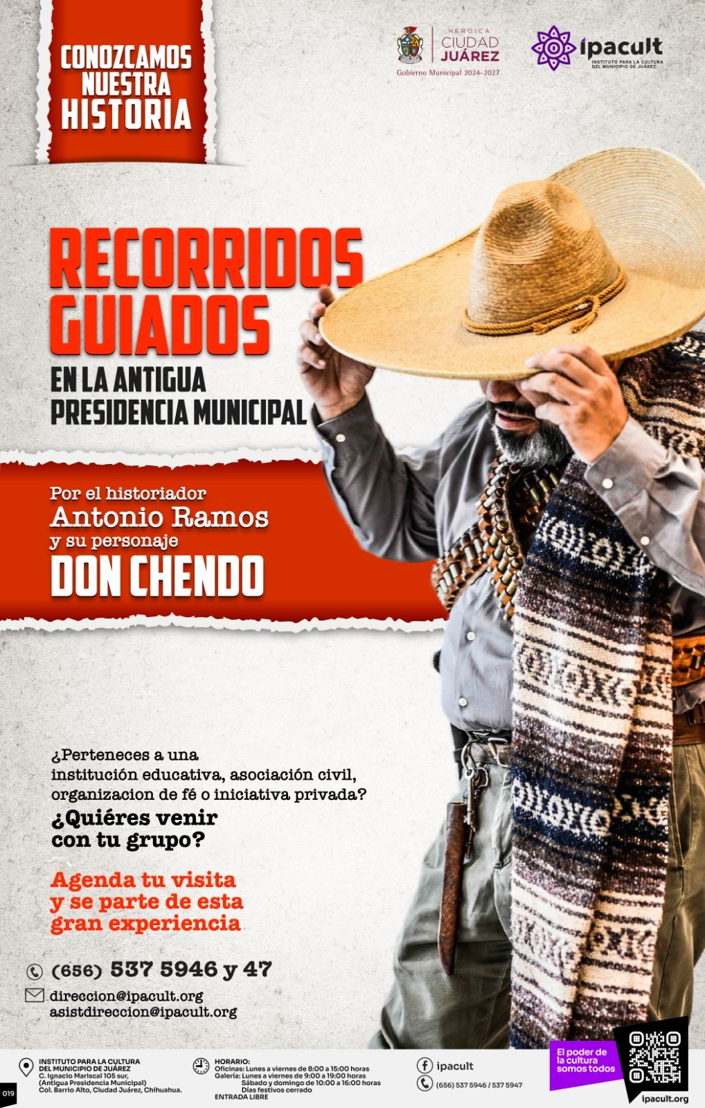 Como parte de las iniciativas para fortalecer la identidad y el conocimiento histórico de la región, el Instituto para la Cultura del Municipio de Juárez (IPACULT) invita a participar en los recorridos guiados en la Antigua Presidencia Municipal.