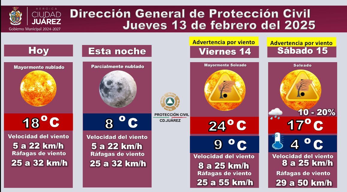 La Dirección General de Protección Civil informa sobre las condiciones climáticas para los próximos días, destacando la emisión de una advertencia por viento para mañana viernes 14 y el sábado 15.