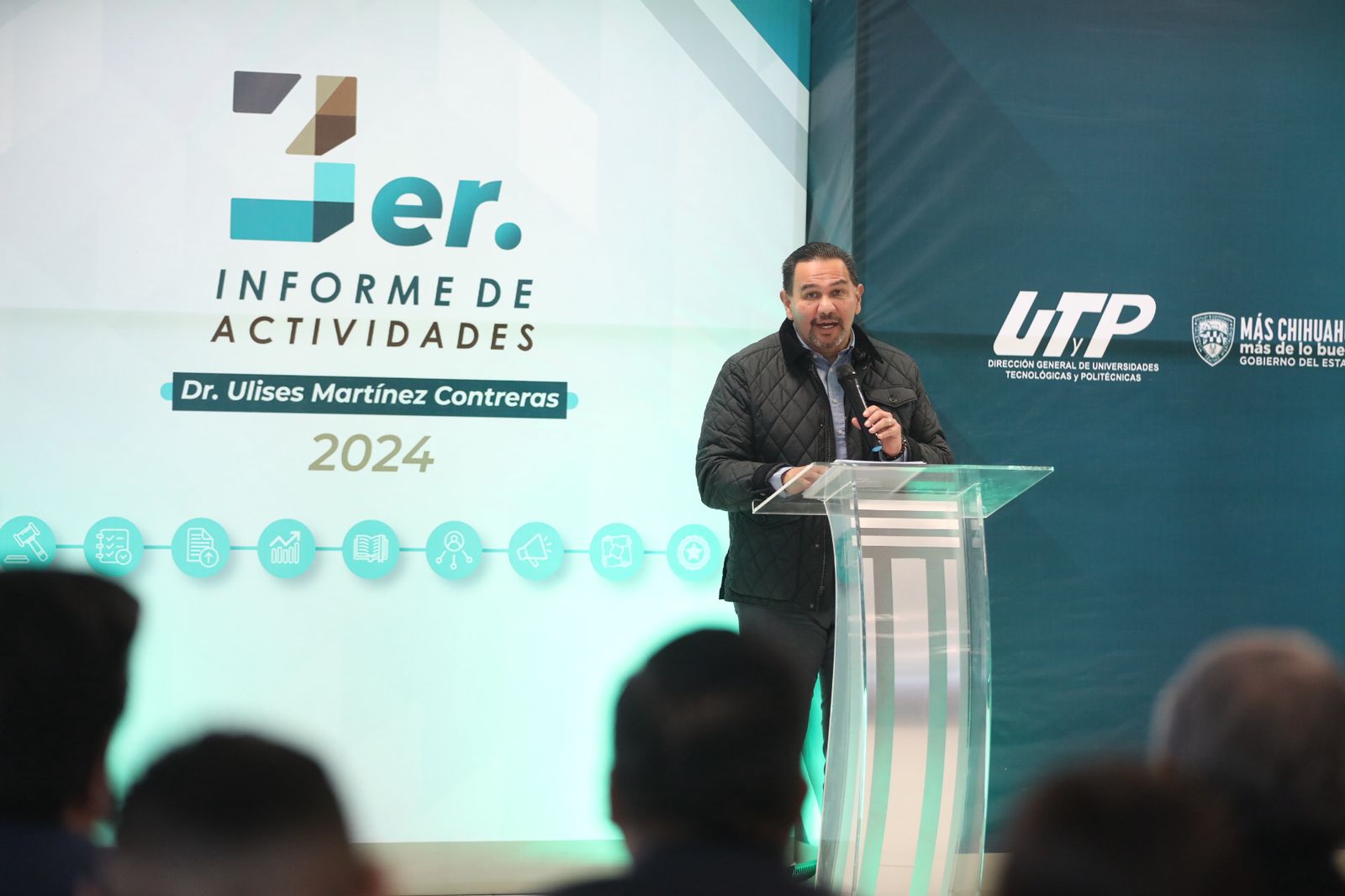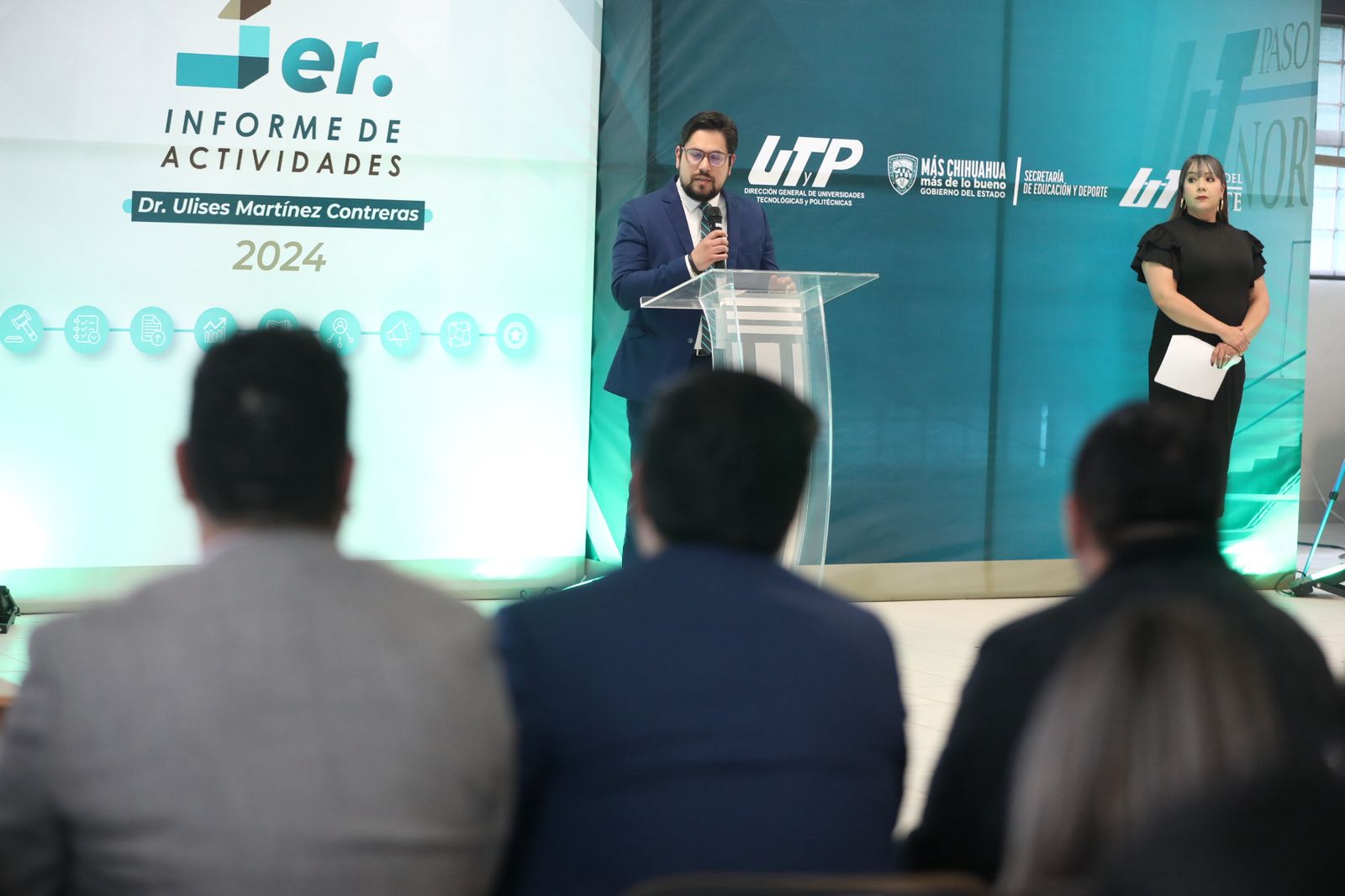 El Presidente Municipal, Cruz Pérez Cuéllar, acudió este día al Tercer Informe de actividades del rector de la Universidad Tecnológica Paso del Norte (UTPN), Ulises Martínez Contreras.