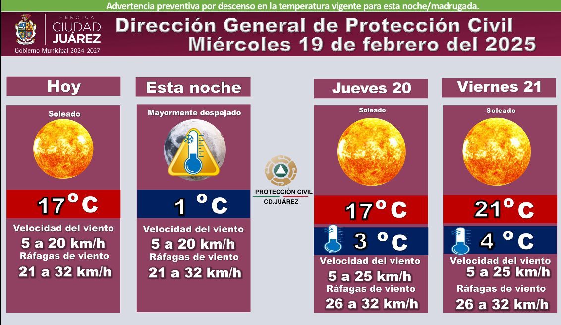 Este miércoles 19 el día se mantendrá soleado con una temperatura máxima de 17°C y vientos de 5 a los 20 kilómetros por hora, con ráfagas de hasta 32 kilómetros por hora.
