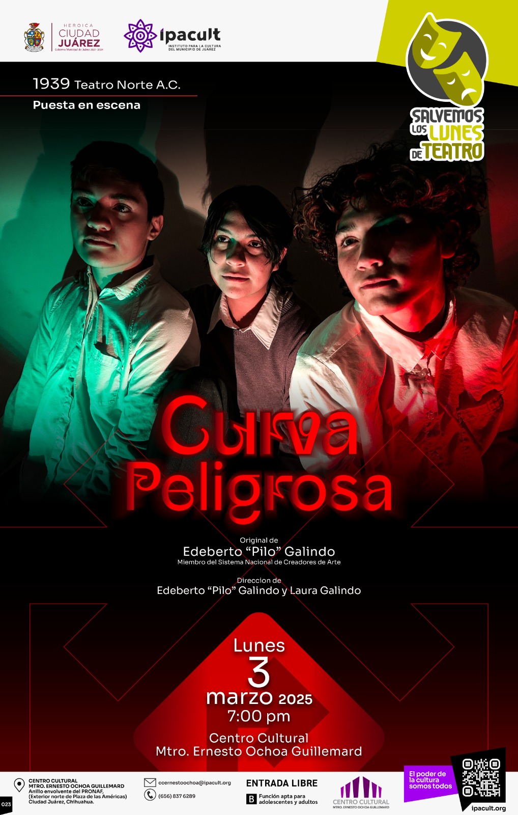 El Instituto para la Cultura del Municipio de Juárez (IPACULT) reafirma su compromiso con la difusión del arte y la cultura en la ciudad al invitar a la comunidad juarense a disfrutar de manera gratuita la puesta en escena "Curva Peligrosa", del reconocido dramaturgo Edeberto "Pilo" Galindo.