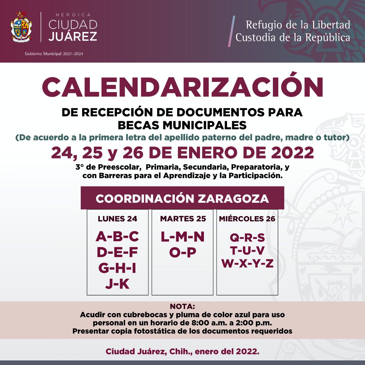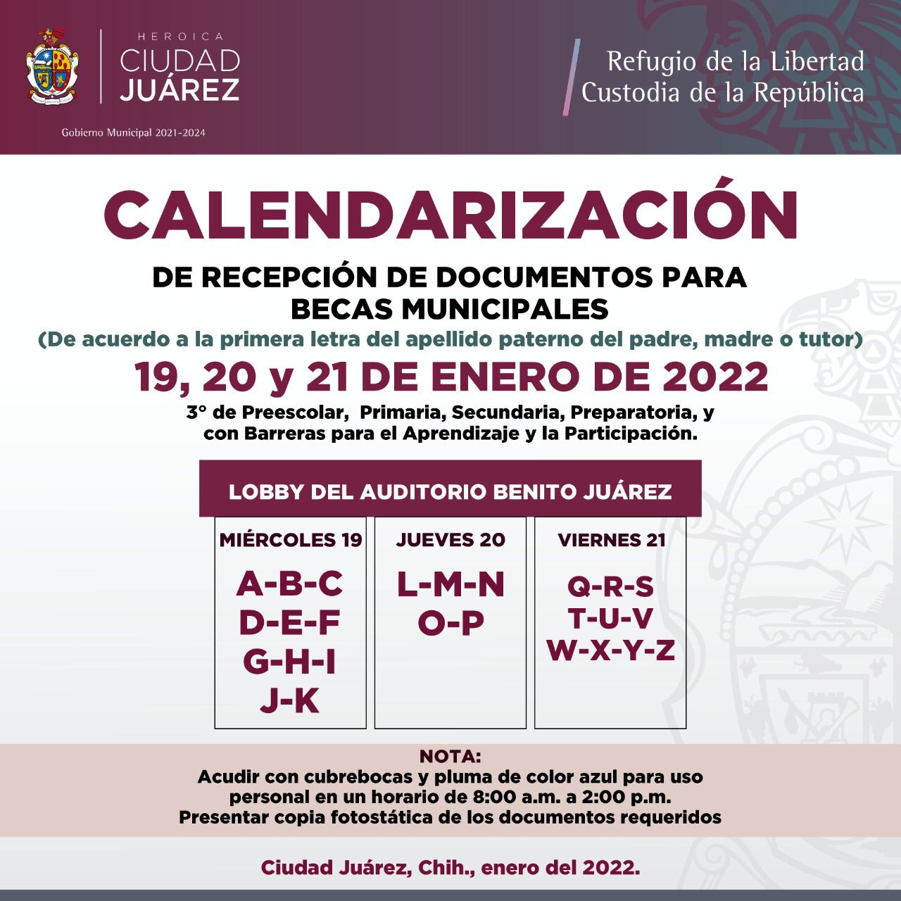 La directora de la dependencia, Martha Aracely González Holguín, informó que la recepción de documentos será a partir del día 19 y hasta el 21 de enero en el Auditorio Municipal Benito Juárez, mientras que del 24 al 26 de enero se entregarán en la Coordinadora de Atención Ciudadana del Suroriente, en la colonia Zaragoza, de acuerdo a la primera letra del apellido paterno del padre, madre o tutor.