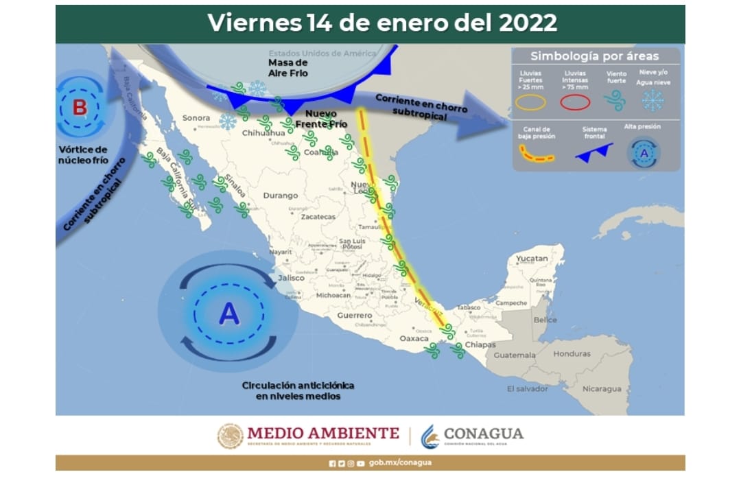 Mientras que el día viernes se espera el ingreso del frente frío número 22 a la frontera norte de México, impulsado por una masa de aire polar que se combinará con la corriente en chorro, provocando lluvias y rachas fuertes de viento en el noroeste y norte del país.
