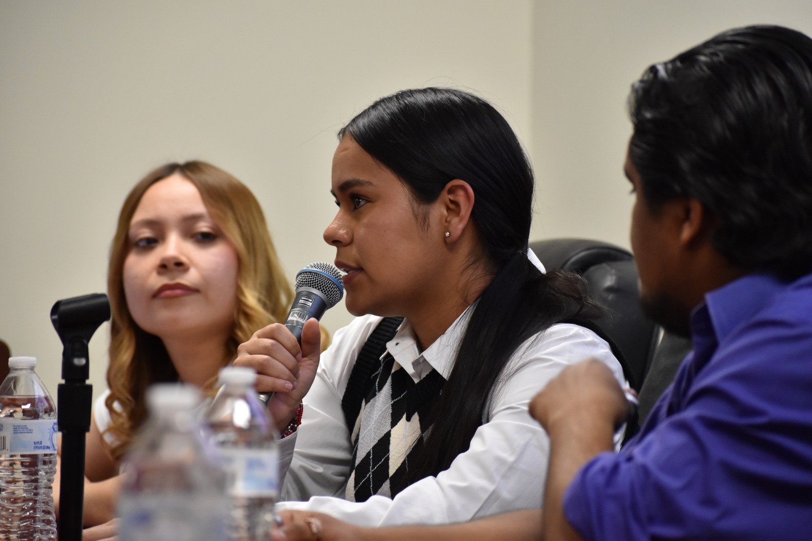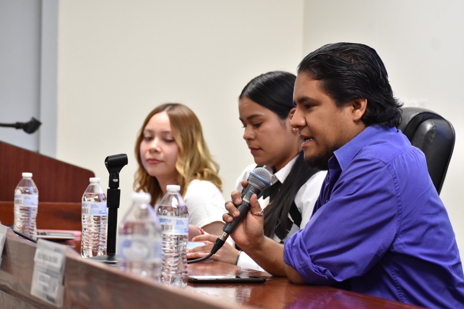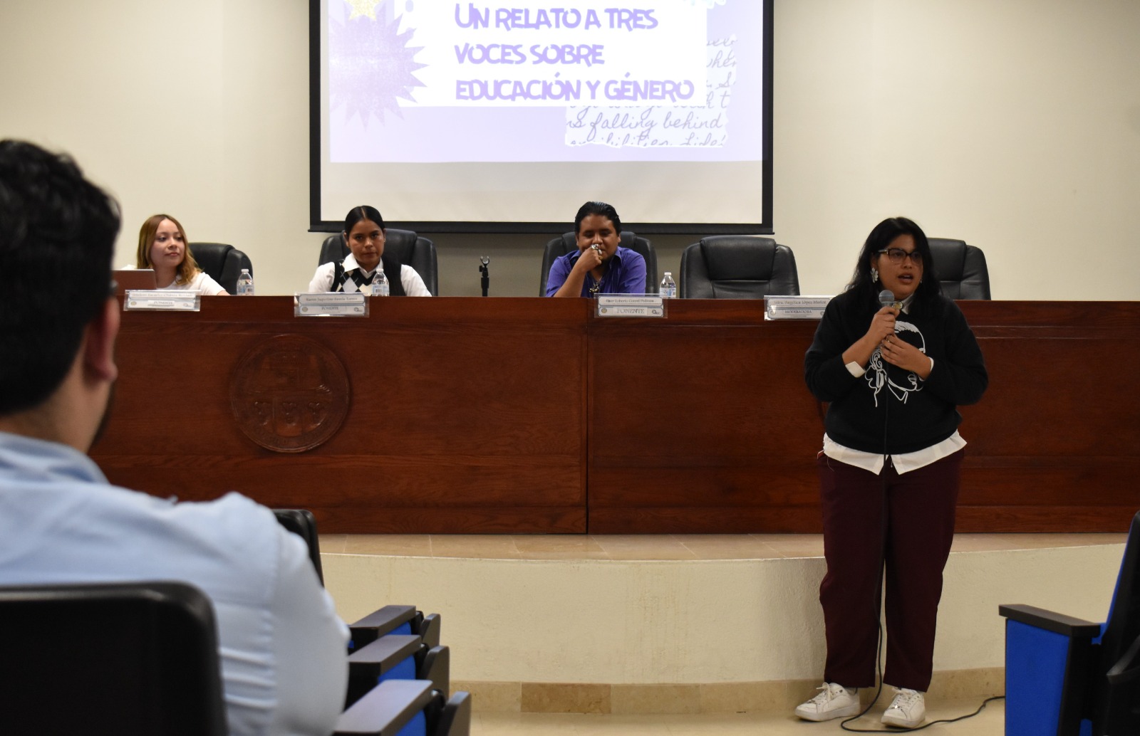 Como parte de la agenda de actividades se llevó a cabo la mesa de diálogo "Desde adentro: un relato a tres voces sobre educación y género", moderada por la encargada de Investigación del IMM, Angélica López Muñoz, y en la que participaron Meleni Chávez, Karen Favela y Eber Corral, estudiantes de la Licenciatura en Educación que realizan sus prácticas profesionales en el Instituto.