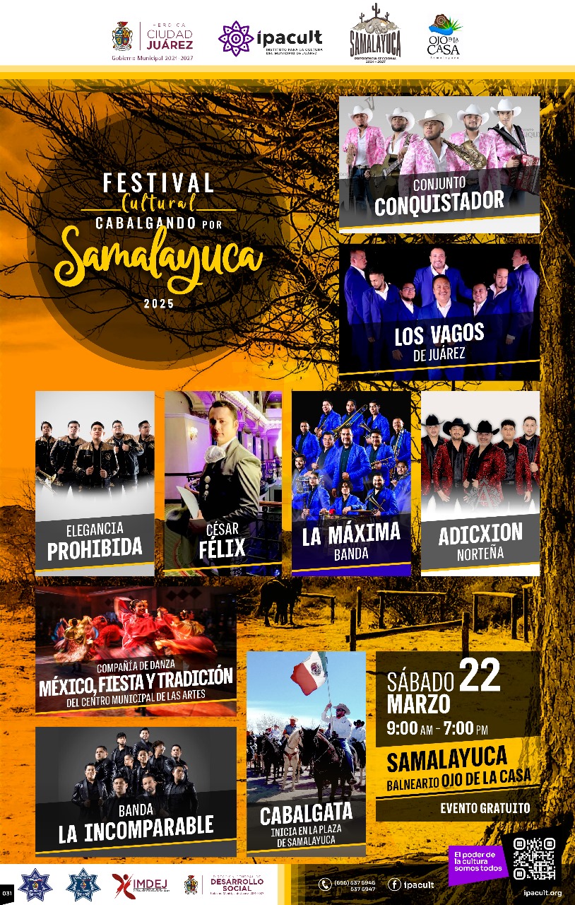 El Instituto para la Cultura del Municipio de Juárez (IPACULT), en colaboración con el Gobierno Municipal y la Presidencia Seccional de Samalayuca, invita a la ciudadanía a participar en el Festival Cultural “Cabalgando por Samalayuca”, que se celebrará el próximo sábado 22 de marzo en el balneario Ojo de la Casa, de Samalayuca, a partir de las 9:00 de la mañana.