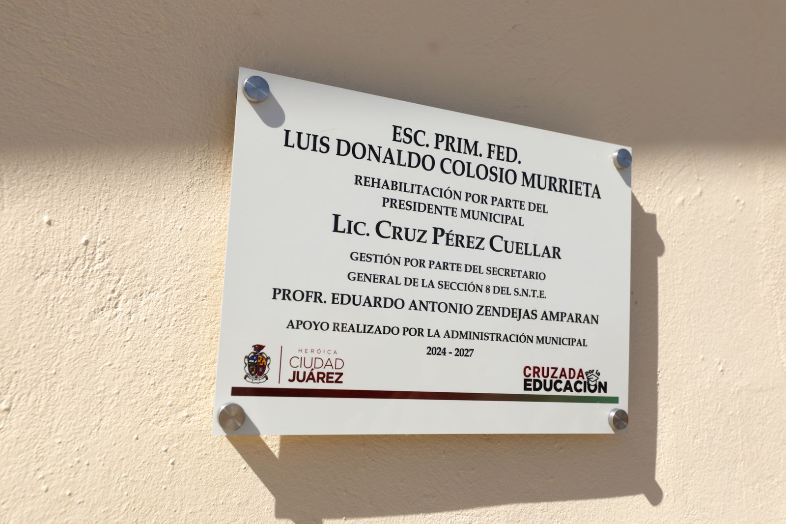 En la entrega estuvieron Guillermo Alvídrez Olivas, director de Educación Municipal; Ismael Rueda, coordinador de Infraestructura Educativa; Arturo Rivera Barreno, titular de Servicios Públicos, así como el regidor Jorge Marcial Bueno; Claudia Sánchez, representante de la sociedad de padres; Gloria Yolanda Chavira Tarango, supervisora de la Zona 55 y Mario Alonso Ptasnik, jefe del sector 12.