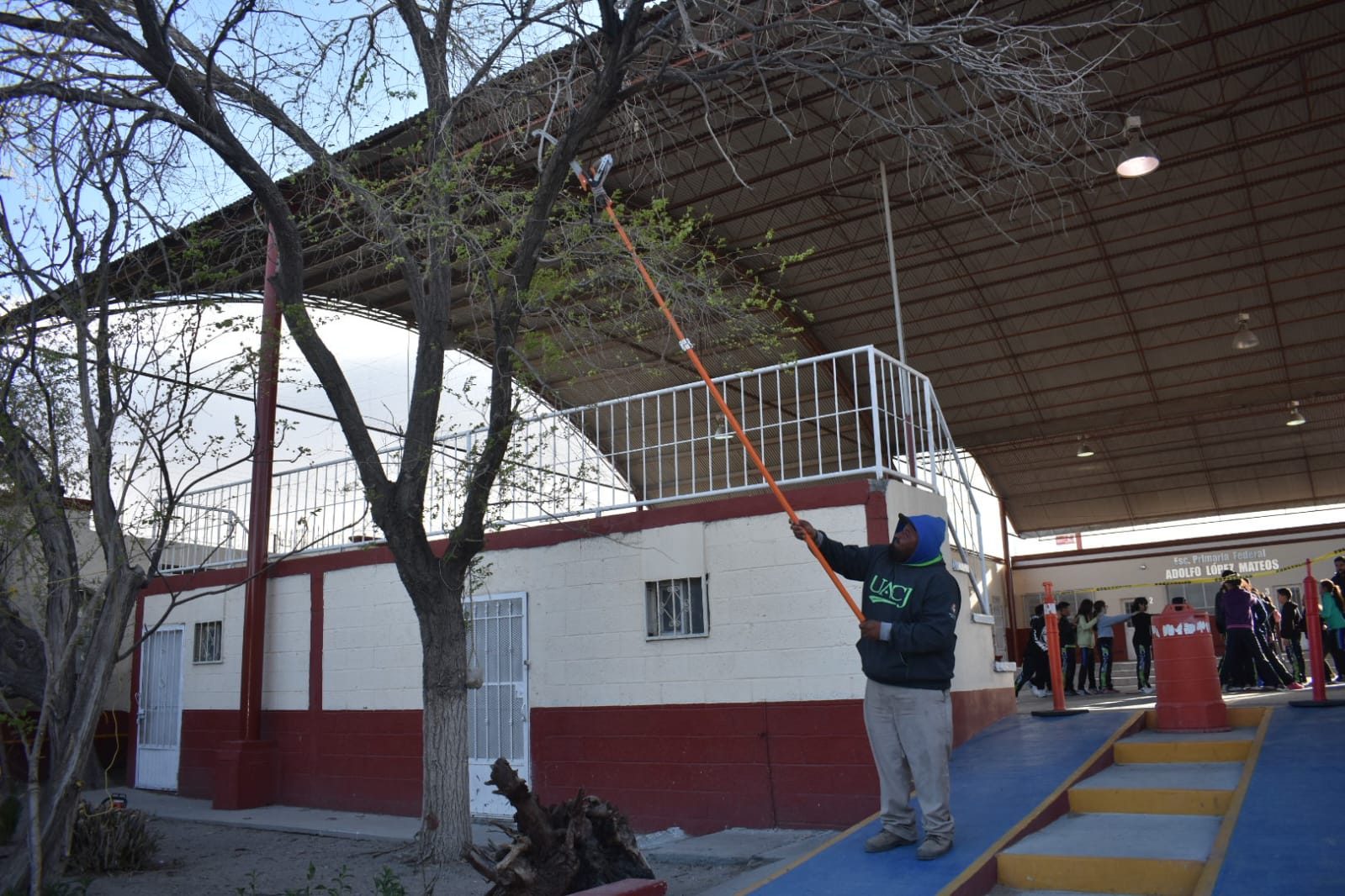Personal de la Dirección de Parques y Jardines trabajó en el retiro de árboles secos y dio mantenimiento a las áreas verdes de la Primaria Adolfo López Mateos, ubicada sobre la avenida Morelia en la colonia Del Real, dio a conocer Daniel Iván Zamarrón Saldaña, titular de la dependencia.